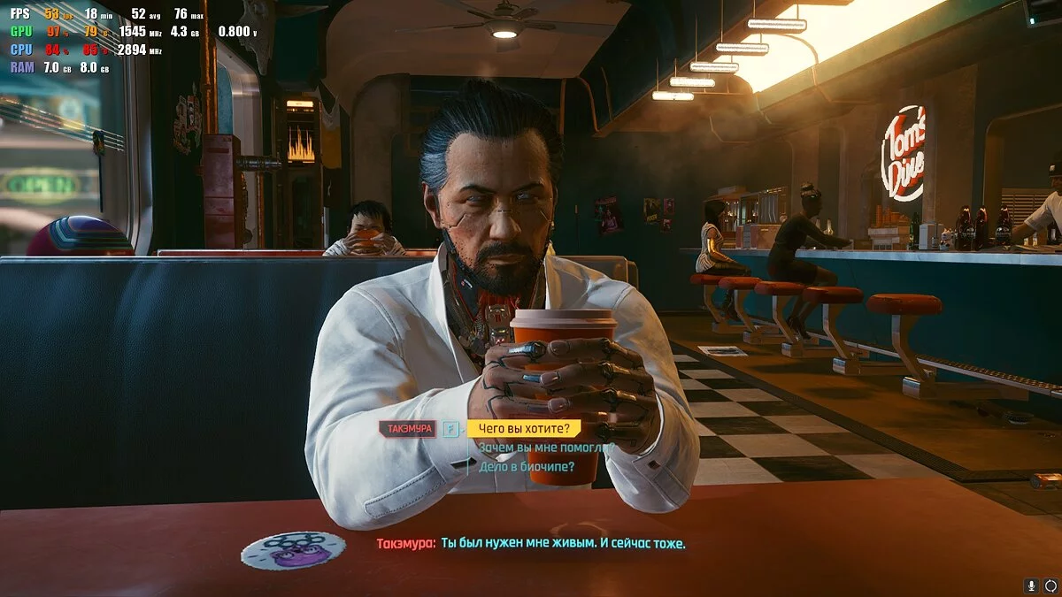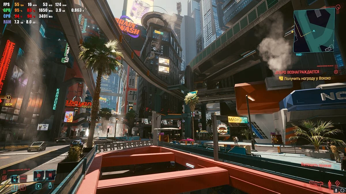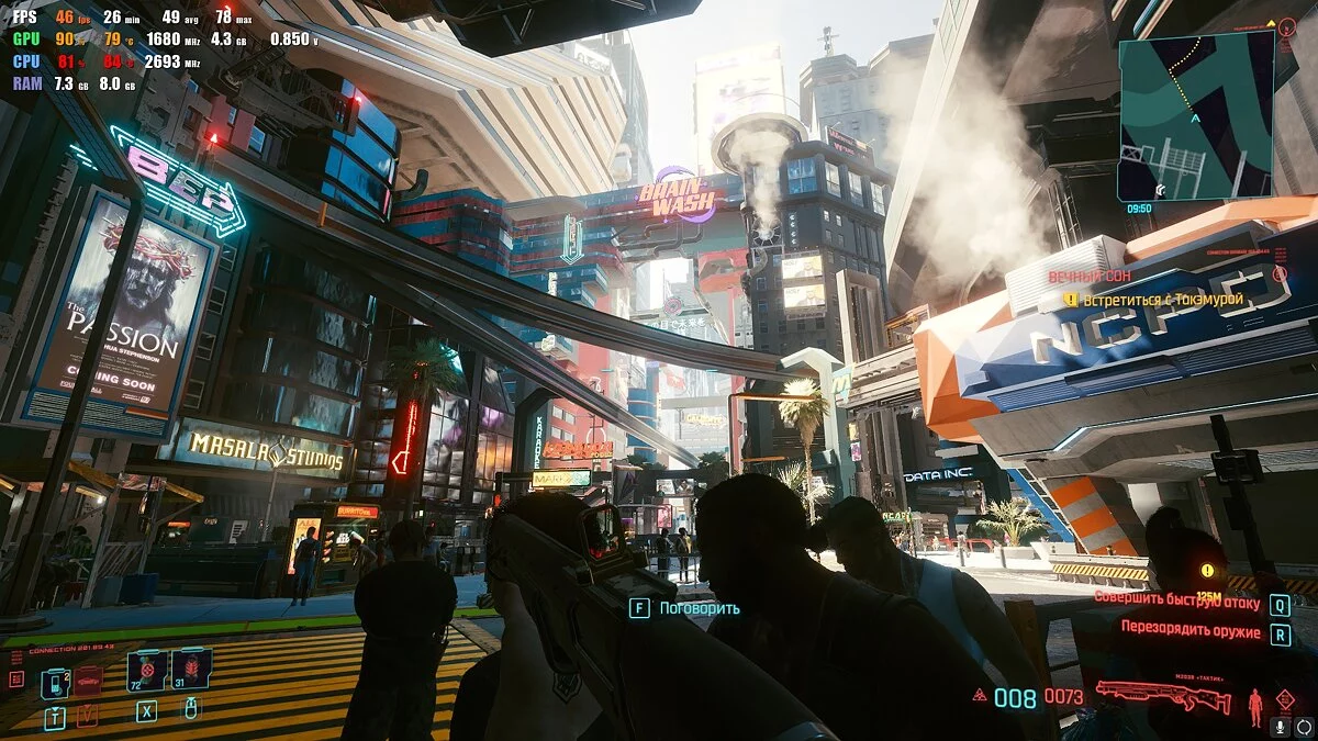 Тем не менее, узнать, как покажет себя Найт-Сити на нашем ноутбуке уже в 2020 году, было любопытно — и мы не удержались. Но чуда не произошло, и на средних, а где-то и низких настройках счетчик FPS в основном не превышал 50 кадров в секунду.