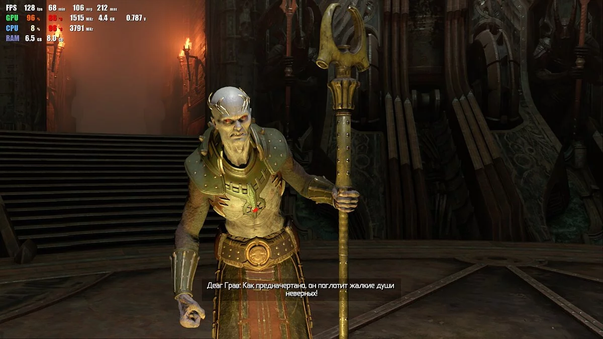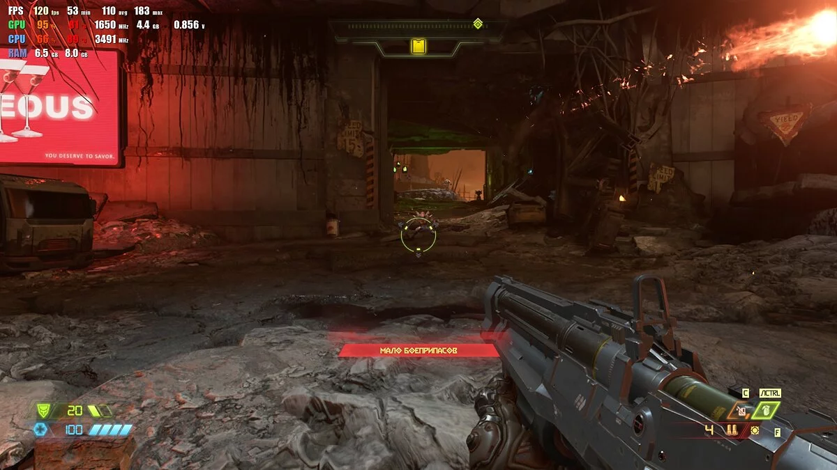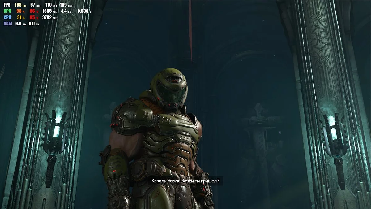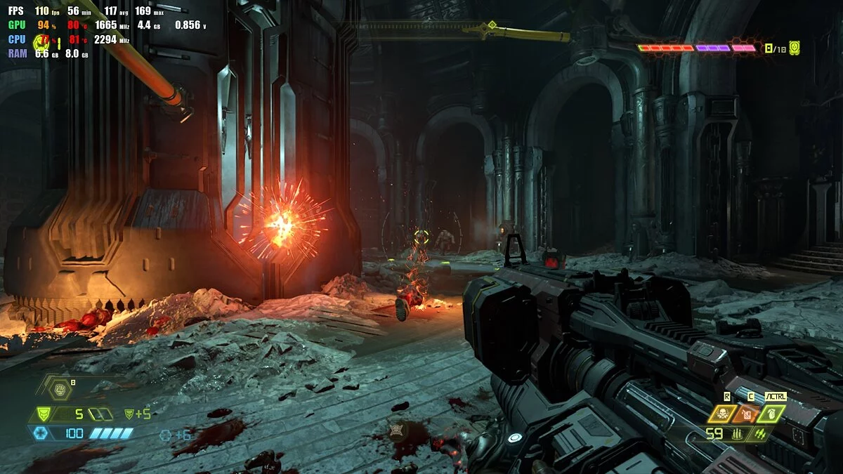 Из киберпанкового мегаполиса мы перебрались в Doom Eternal, которая работает на более стабильном движке, поэтому частота кадров увеличилась. Здесь уже можно было увидеть заветные 144 FPS, правда нечасто. Тем не менее, плавность картинки выросла значительно. Даже если поставить все настройки на высокие, то можно получить около 90-100 кадров в секунду.
