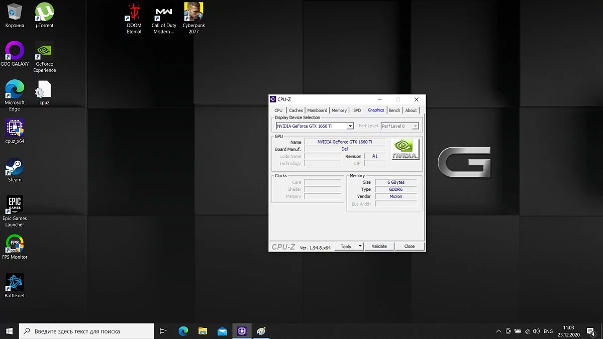 - Видеокарта: NVIDIA GeForce GTX 1660 Ti, 6 Гбайт памяти GDDR6