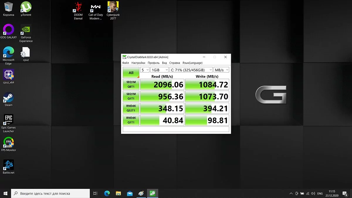 В классическом формате мы проверили производительность в следующих синтетических тестах: CPU-Z, Cinebench R20 и Crystal Disk Mark. Результаты — на скриншотах.