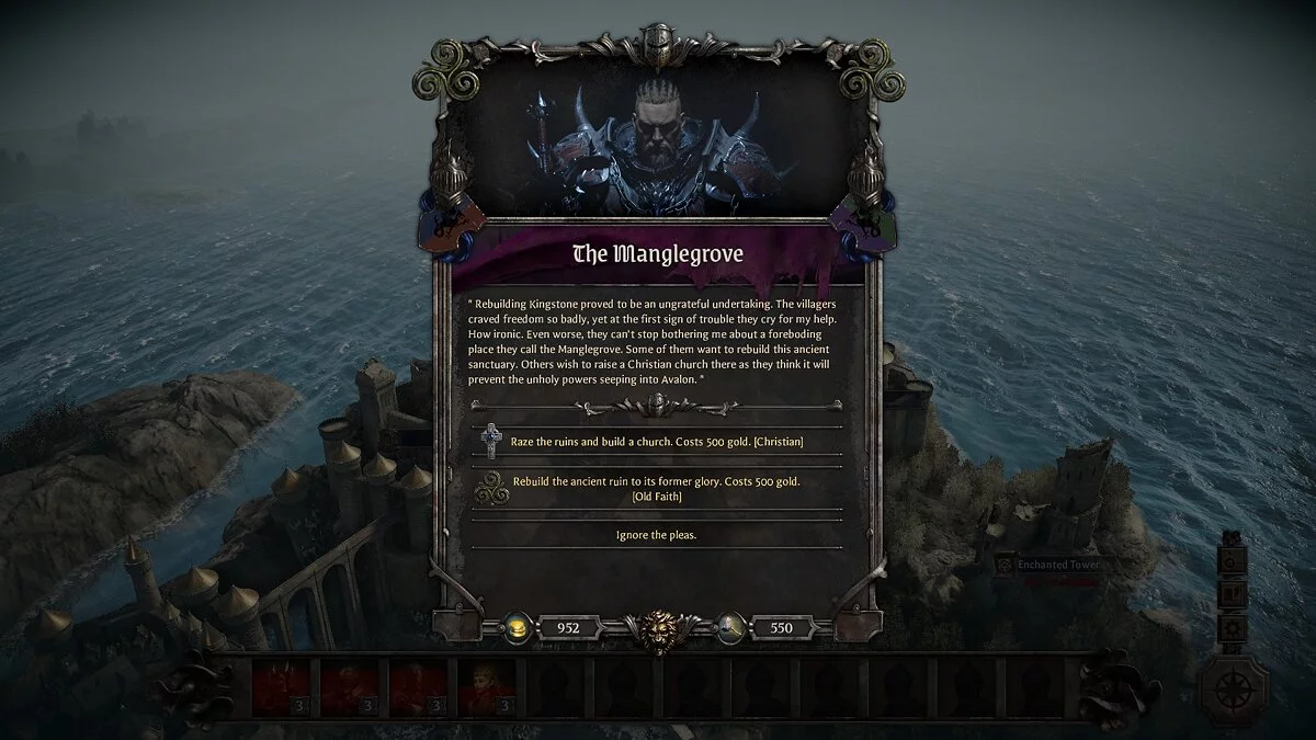 Помимо этого, как во время основных заданий, так и на глобальной карте, необходимо принимать важные решения, которые формируют характер Мордреда. От них зависит будет ли он справедливым правителем или безжалостным тираном, праведным христианином или язычником. Каждый выбор открывает определённые навыки и возможности, позволяет нанимать конкретных героев и вообще влияет на отношение подданных. По заявлениям разработчиков, недовольные нашим поведением сопартийцы могут покинуть отряд или даже пойти на нас войной, но в раннем доступе так сильно взбесить «коллег», увы, невозможно.
