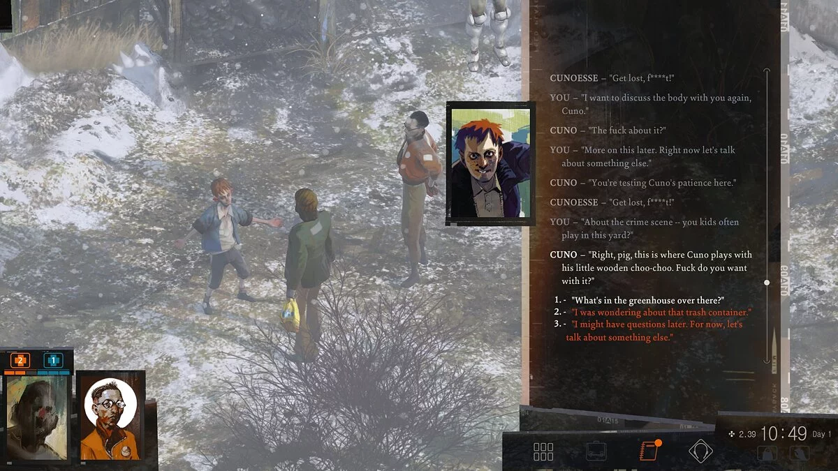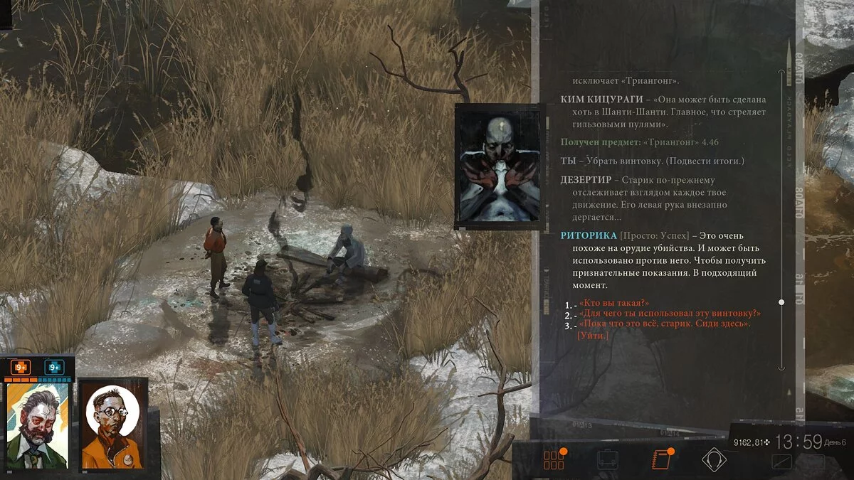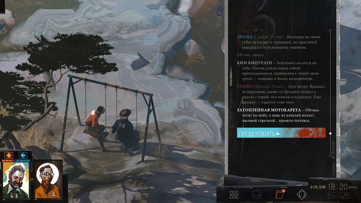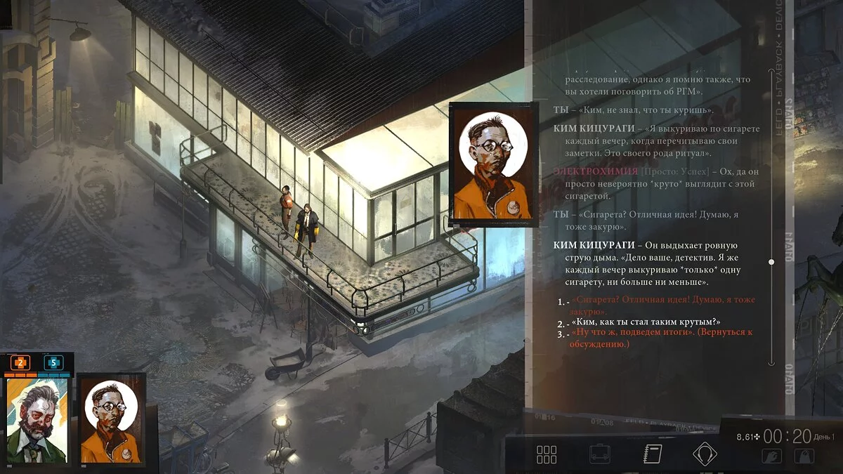 Disco Elysium усаживает игрока на настоящие эмоциональные качели. Вот мы погружаемся в мрачные заговоры и туманные разборки забастовщиков — и тут же случаются забавные, на грани абсурда вещи, вроде знаменитого слизывания спиртного со стола. Вот мы пристаём к случайной прохожей и просим дать нам любое дело для расследования, вплоть до поиска какаду — а через день находим на мосту замерзший труп и понимаем, что это муж той самой женщины, и теперь нам же придётся рассказать ей об утрате. Прикидываться дурачком, безусловно, весело, но стоит только подойти к таксофону у рыбного рынка, машинально набрать номер, как игра схватит за живое, объясняя, что главный герой, несмотря на чудаковатость, прежде всего — человек, а игрок — лишь его проводник.