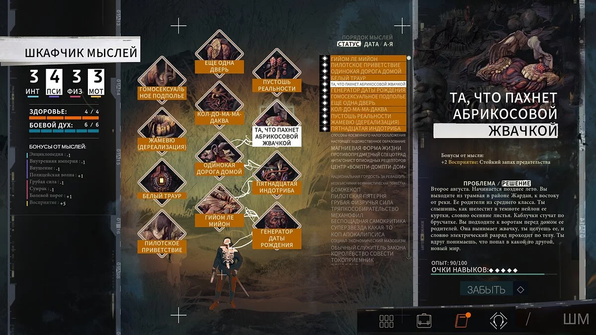 Основные навыки дополняют своеобразные перки — «мысли». За выполнение секретных заданий, некоторые диалоги и поступки, прокачку определенных навыков сознание предлагает Гарри для исследования разные идеи, которые позволяют выбирать идеалы персонажа. К примеру, изученная гомосексуальная мысль поможет раскрыть истинную ориентацию одного из близких Дюбуа людей. Мыслей в игре столько, что опробовать все за одно прохождение нереально.