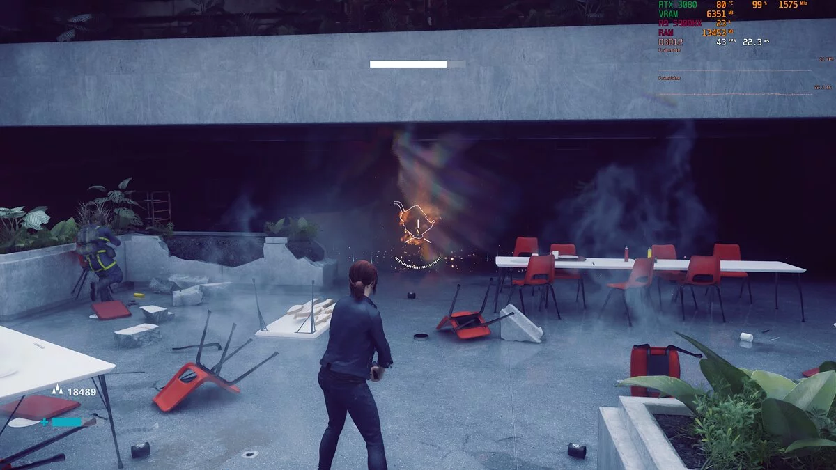 Control мы запускали при максимальных настройках с разрешением 4К (разрешение рендеринга — 1080p). Технология DLSS включена, рейтрейсинг на максимум. В таком режиме игра выдавала от 40 до 50 кадров в секунду. Даже в тяжелых сценах, например в коридоре на точке «Аппаратная АЭК», со множеством отражений производительность не проседала. Только изредка можно было заметить кратковременные просадки до 35 кадров.