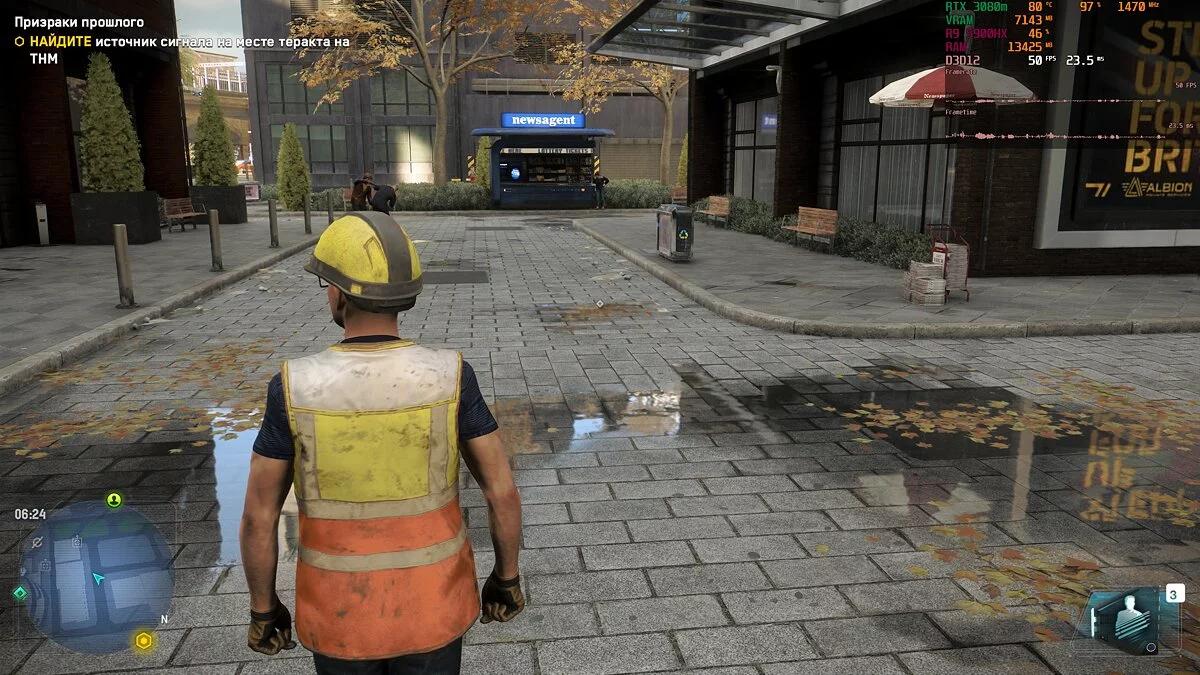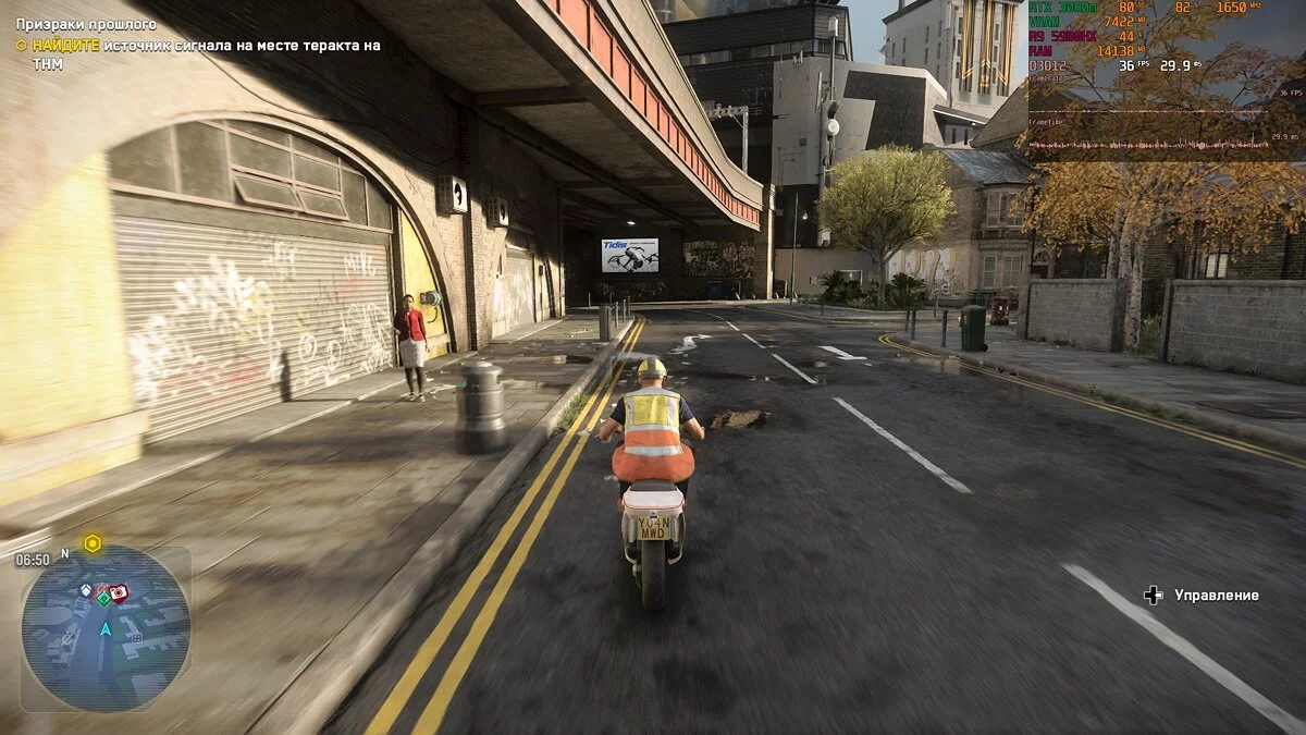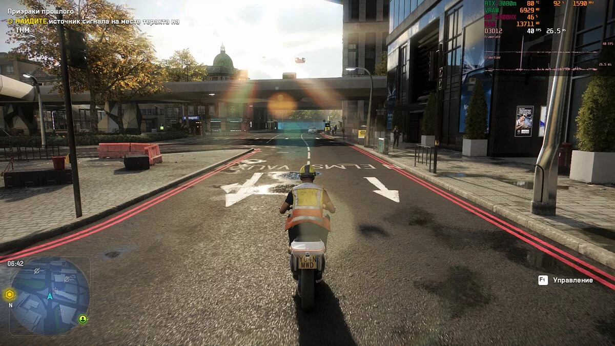 Для Watch Dogs: Legion мы выбрали разрешение 4К, очень высокие настройки графики, «высокую» трассировку лучей, DLSS установили в режим «Производительность». Игра при этом выдавала 40-50 кадров. В особо тяжелых условиях, например при быстрой езде по городу, могли быть просадки до 35 кадров.