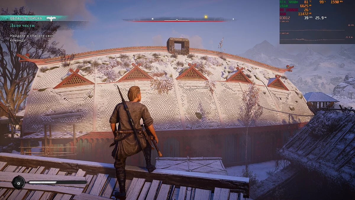 Производительность Assassin's Creed Valhalla — хороший показатель, как система справляется с требовательными играми без трассировки лучей и DLSS. Настройки максимальные (в терминологии игры «Самые высокие»), разрешение 4К. Игра в таком режиме выдает 30-40 кадров. Также мы прогнали и встроенный бенчмарк. Результаты — на скриншотах. Если опуститься до очень высоких настроек, то фреймрейт подрастёт до 40-50 кадров.