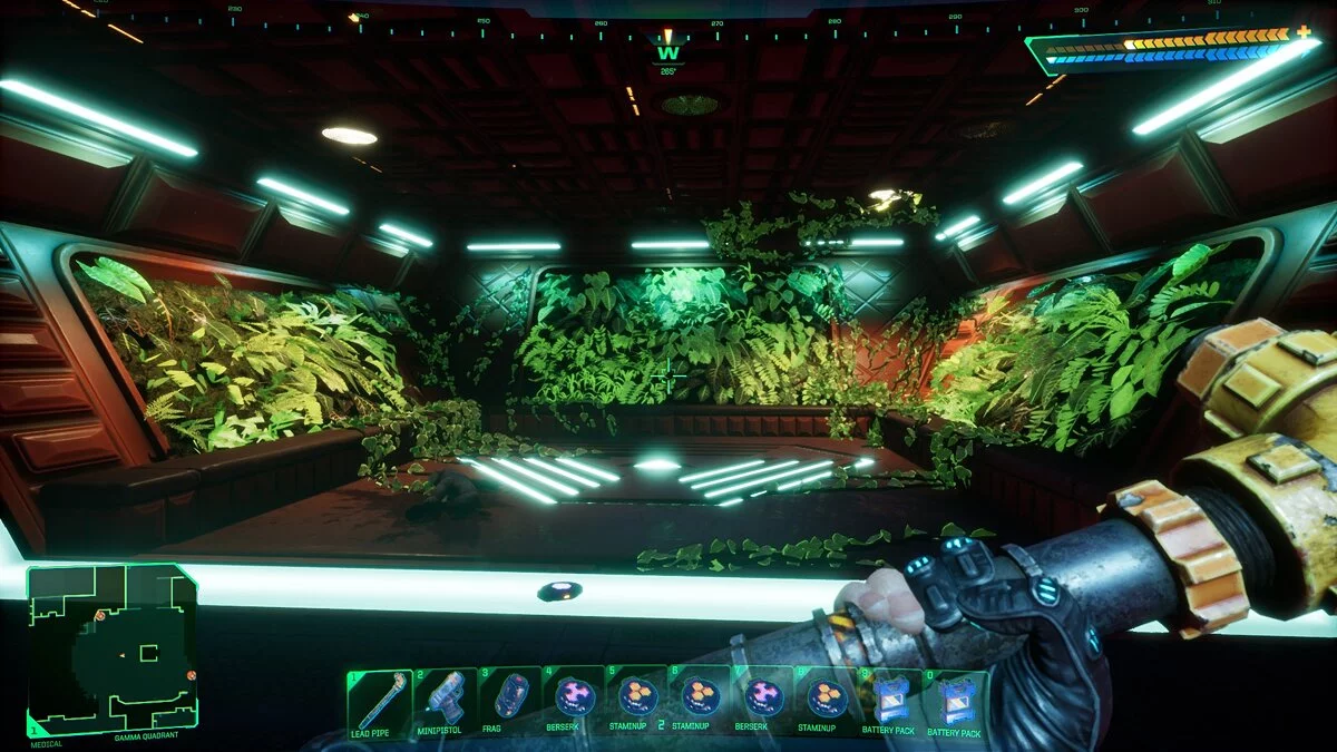 Остаётся бродить по каким-то кишкам и старательно выискивать среди труб, приборов и серых стен любую малость, за которую мог бы зацепиться глаз. По меркам System Shock зелёный уголок в холле выглядит настоящей феерией.