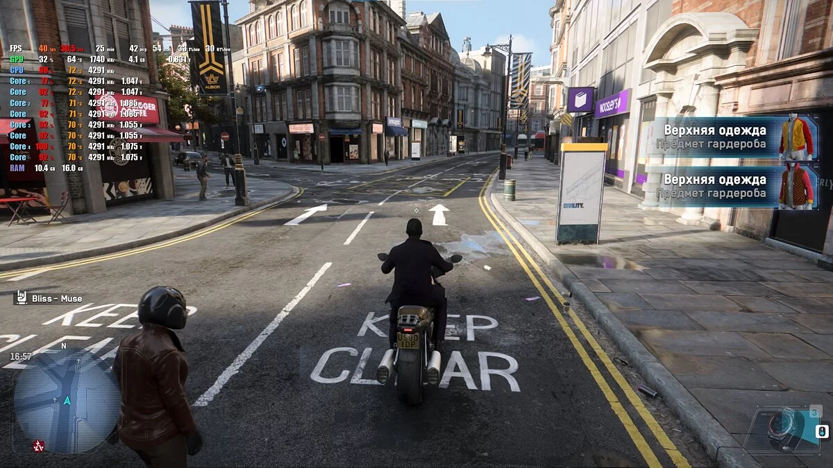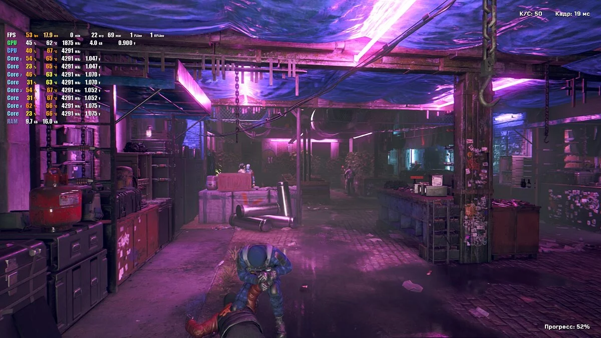 Чуда в Cyberpunk 2077 не случилось. Игра по-прежнему выжимает все соки из процессоров, а здесь стоит пусть и новый, но не самый мощный CPU, во что и упирается FPS на высоких настройках. С использованием DLSS в режиме «Производительность» можно получить плавающие 50-60 кадров в секунду.