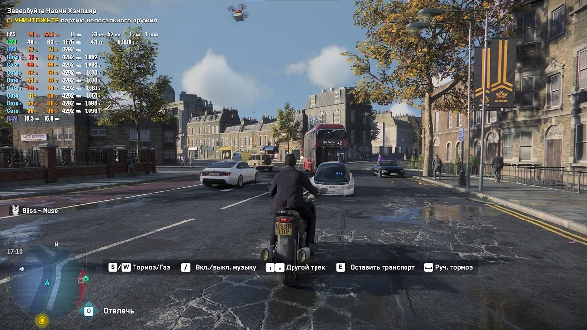 В Watch Dogs: Legion мы выставили «очень высокие» настройки и сразу же включили трассировку лучей с DLSS. Вполне ожидаемо, что наполненный лужами и машинами город заставил ноутбук усердно поработать. Результатом стали 50 FPS с просадками до 40 кадров в секунду.