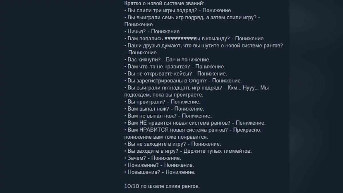 Очень подробный комментарий о системе рангов в Counter-Strike: Global Offensive.