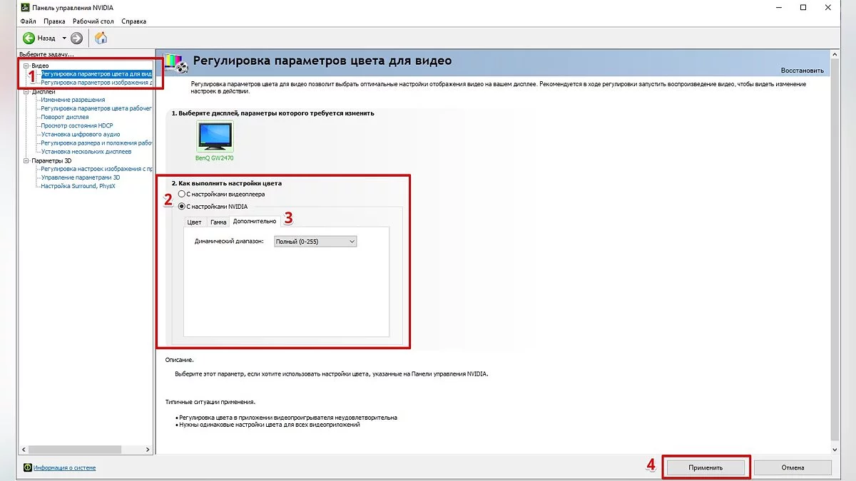 Зайдите также в раздел «Видео» и «Регулировка параметров цвета для видео». Включите переключатель «С настройками NVIDIA» и перейдите на вкладку «Дополнительно». Активируйте полный динамический диапазон.