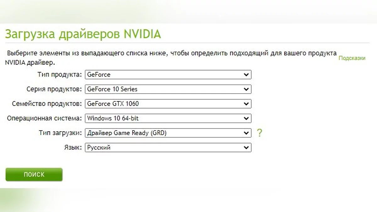 Скачать драйвер NVIDIA можно на официальном сайте. Заполните поля в соответствии с вашей видеокартой и операционной системой. Также выбирайте Game Ready, так как студийные драйвера предназначены для рабочего софта.
