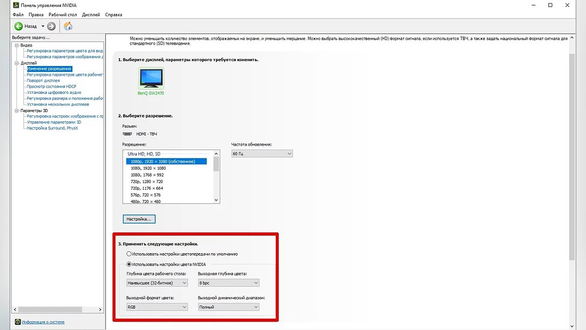 А вот пункт «Применить следующие настройки» уже интереснее. Для наилучшей картинки нужно установить формат цвета RGB и полный динамический диапазон. В случае подключения по DisplayPort это должно стоять по умолчанию, а если используется HDMI, то диапазон может быть ограниченным. В этом случае картинка может казаться бледной, выцветшей.