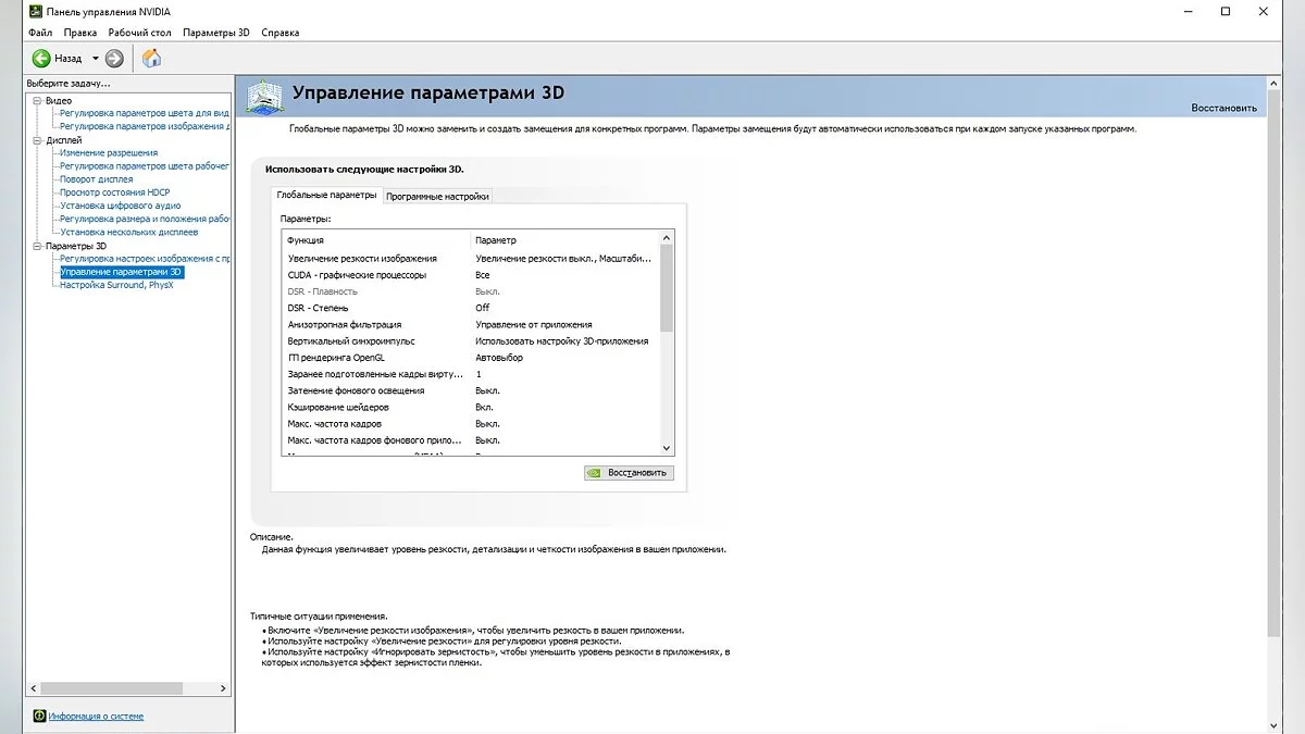 По умолчанию все графические настройки задаются 3D-приложением (в нашем случае игрой). То есть, вы меняете графические настройки, например, качество сглаживания и анизотропной фильтрации, непосредственно в игре. Но драйвер NVIDIA также позволяет тонко настраивать графические параметры. Так, например, можно установить сглаживание для старых игр, где такой опции вообще нет.