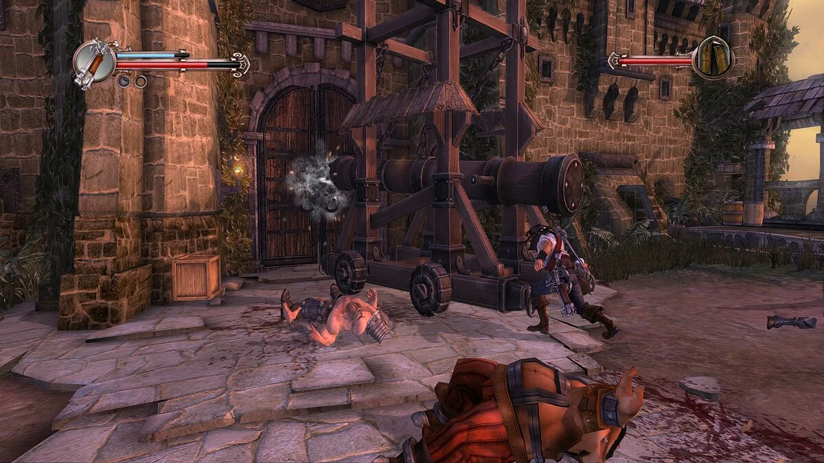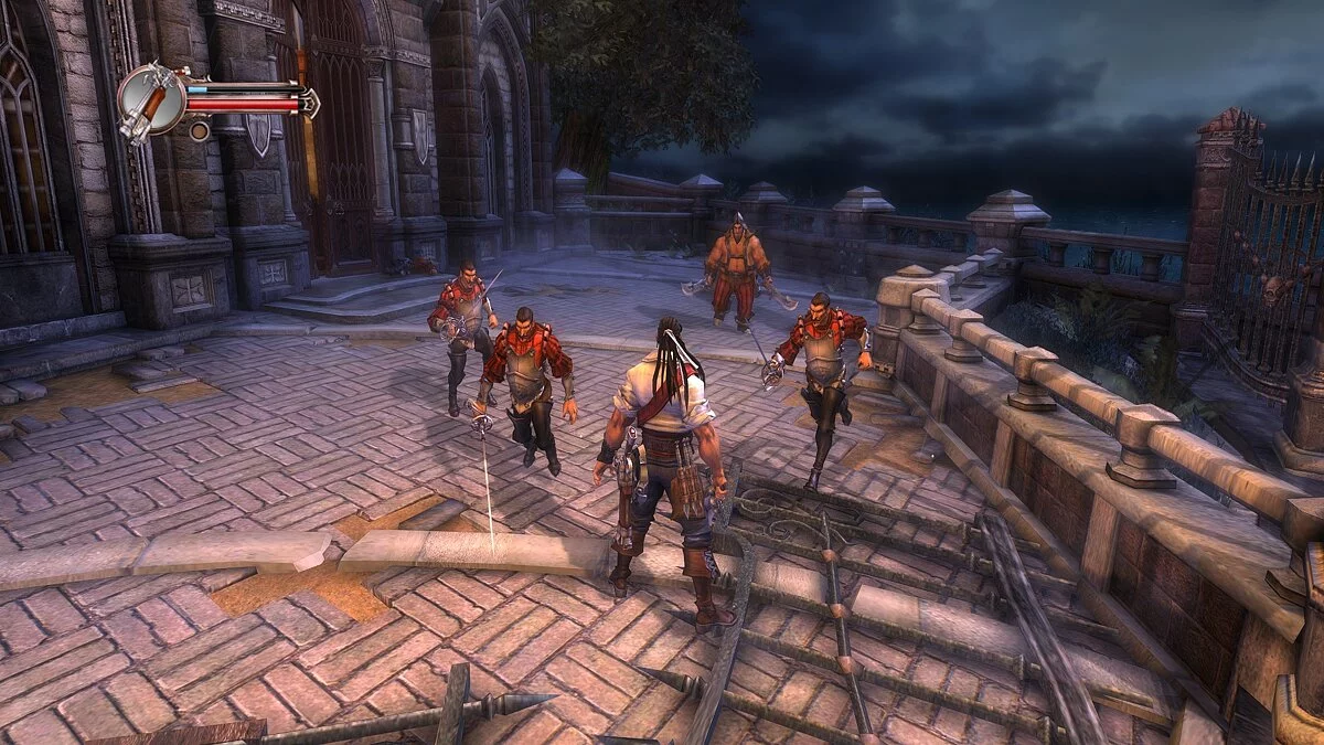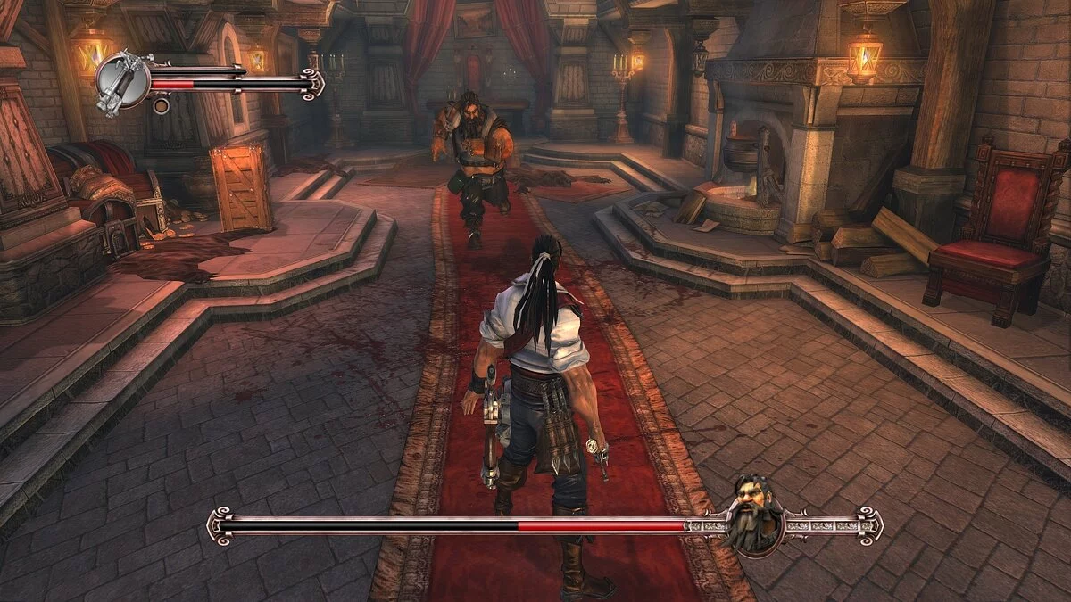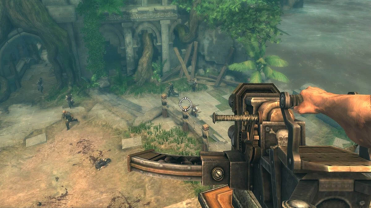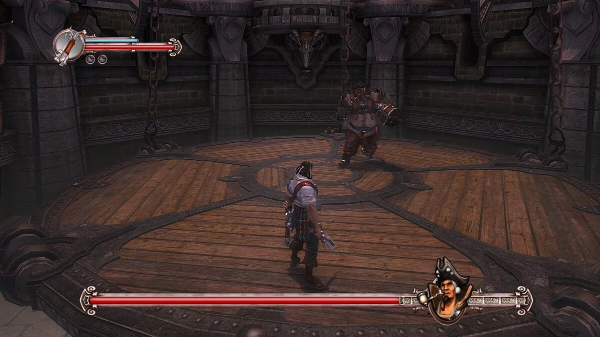 Впрочем, мало кто решит проходить «Приключения капитана Блада» ради сюжета: во главе угла здесь геймплей. Начнём с того, что эта игра — кровавый слэшер, в котором нужно без устали рубить на кусочки толпы врагов. По умолчанию Блад вооружён могучей саблей, дальнобойным пистолетом и мощной бомбой — с этим набором нам и предстоит влетать в толпу и творить эффектные комбо. Когда враг будет достаточно изранен, можно провернуть жестокое добивание, которое отправит оппонента на тот свет.