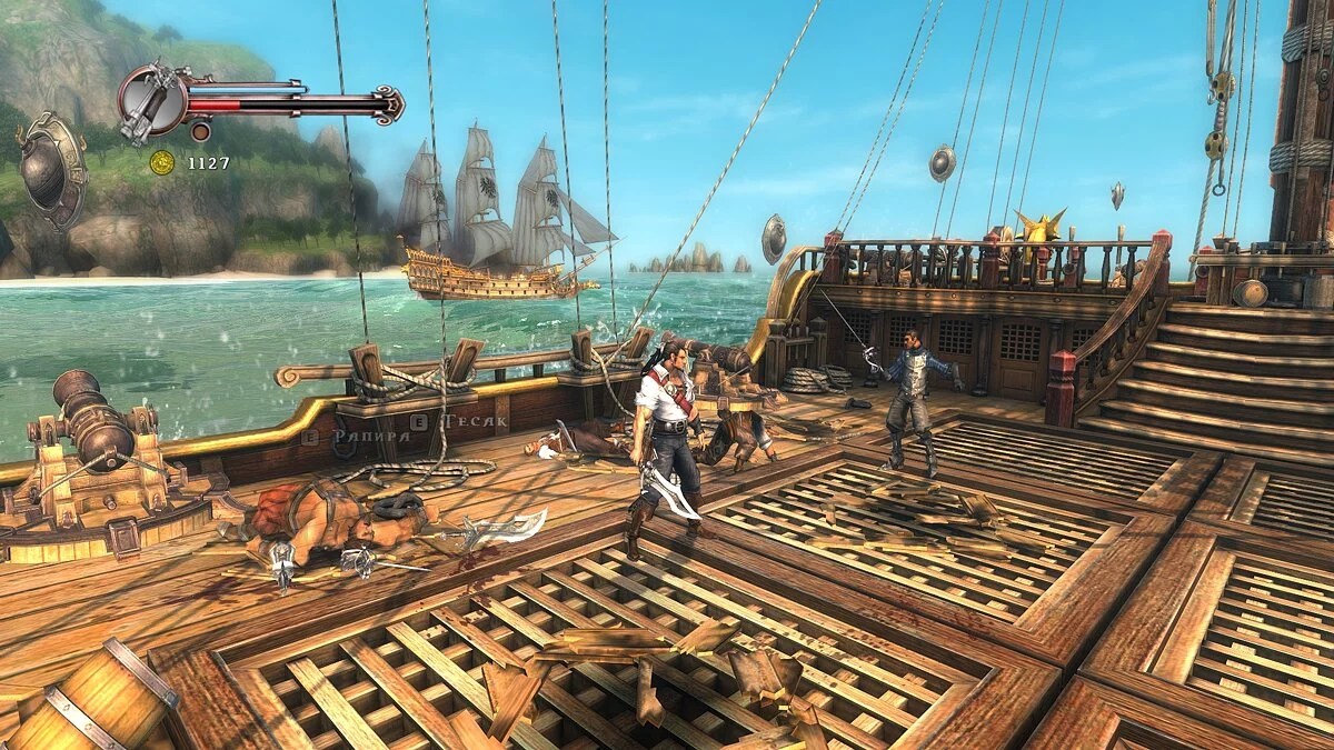 А ещё геймерам обещали морские сражения. Увы, на деле они мало чем отличаются от стандартного геймплея. Блад носится по своему кораблю, отбиваясь от карабкающихся на борт злодеев, а по возможности подбегает к пушке и делает залп по вражескому судну. Реализованы такие эпизоды довольно скучно и быстро утомляют.