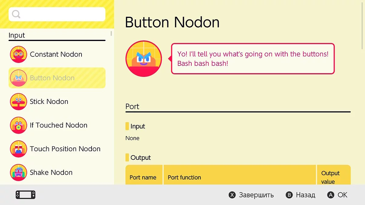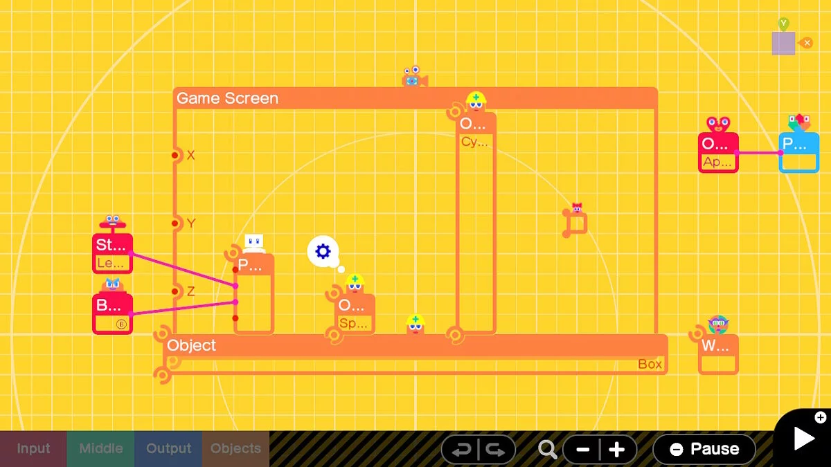 Инструментарий содержит так называемые нодоны (nodon), каждый из которых выполняет определенную функцию — проигрывает звук, выполняет математические действия, выводит на экран текст и тому подобное. Комбинируя различные нодоны и проставляя между ними связи, можно добиться практически любых действий от игровых объектов: настроить управление персонажем, взаимодействие с предметами или запустить определенное событие. Например, чтобы главный герой игры мог двигаться, нужно на экране программирования соединить левый стик с персонажем. Разумеется, продумывать все до мелочей не придется. Так, персонажи уже анимированы: для удара рукой вам достаточно только выбрать нужные параметры и настроить управление.