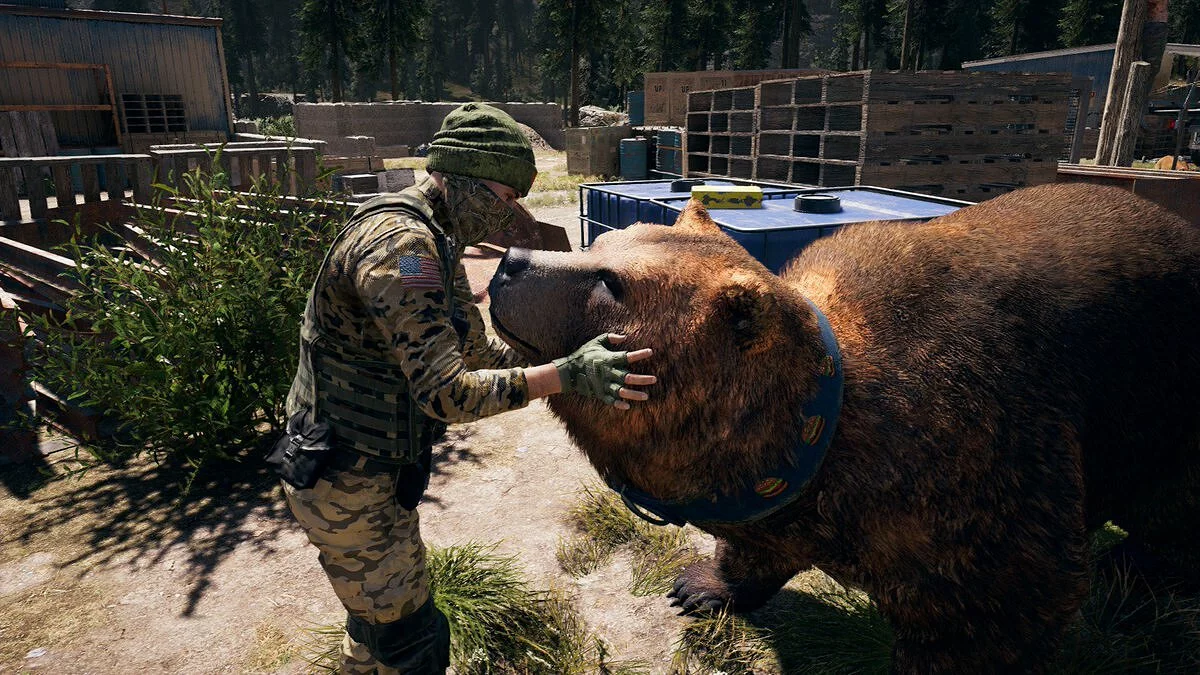 В Far Cry 5 герой однажды получит задание, в котором нужно приручить мишку, накормив его рыбой, а затем отбить атаку безумных сектантов. После Уэйд навсегда отправит здоровенного детину в наш отряд и позволит наводить на аванпосты ужас.