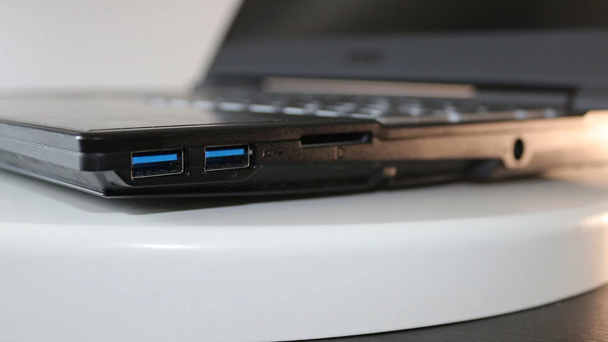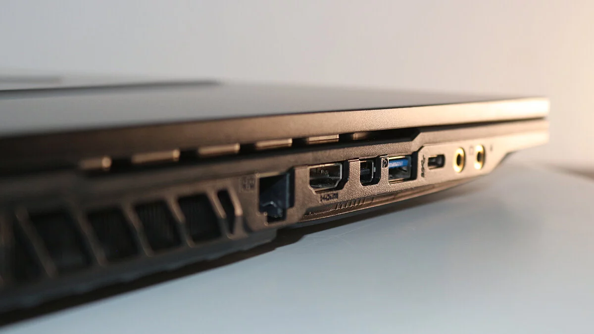 Ноутбук предлагает следующие разъёмы: 1x Type-C USB3.2 Gen2, 3x Type-A USB3.2 Gen1, 1x SD (XC/HC) Card Reader, 1x HDMI (4K @ 30Hz) 1.4, 1x Mini-DisplayPort, 1x RJ45. Блок питания подключается справа почти по середине.