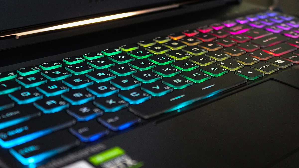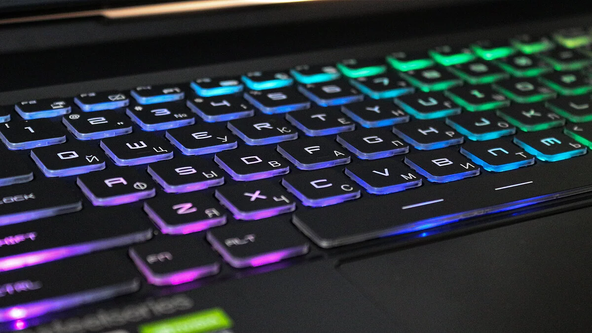 Стоит отметить, что ноутбук не из лёгких — 2,3 кг. Поэтому открывается верхняя крышка одной рукой с трудом. В разложенном виде нас сразу же встречает приятная подсветка полноценной клавиатуры от SteelSeries. Эта подсветка предлагает широкий выбор вариантов свечения. Также каждую клавишу можно настроить индивидуально. Делается без труда в приложении MSI Dragon Center. Есть даже возможность управлять подсветкой с помощью голоса.