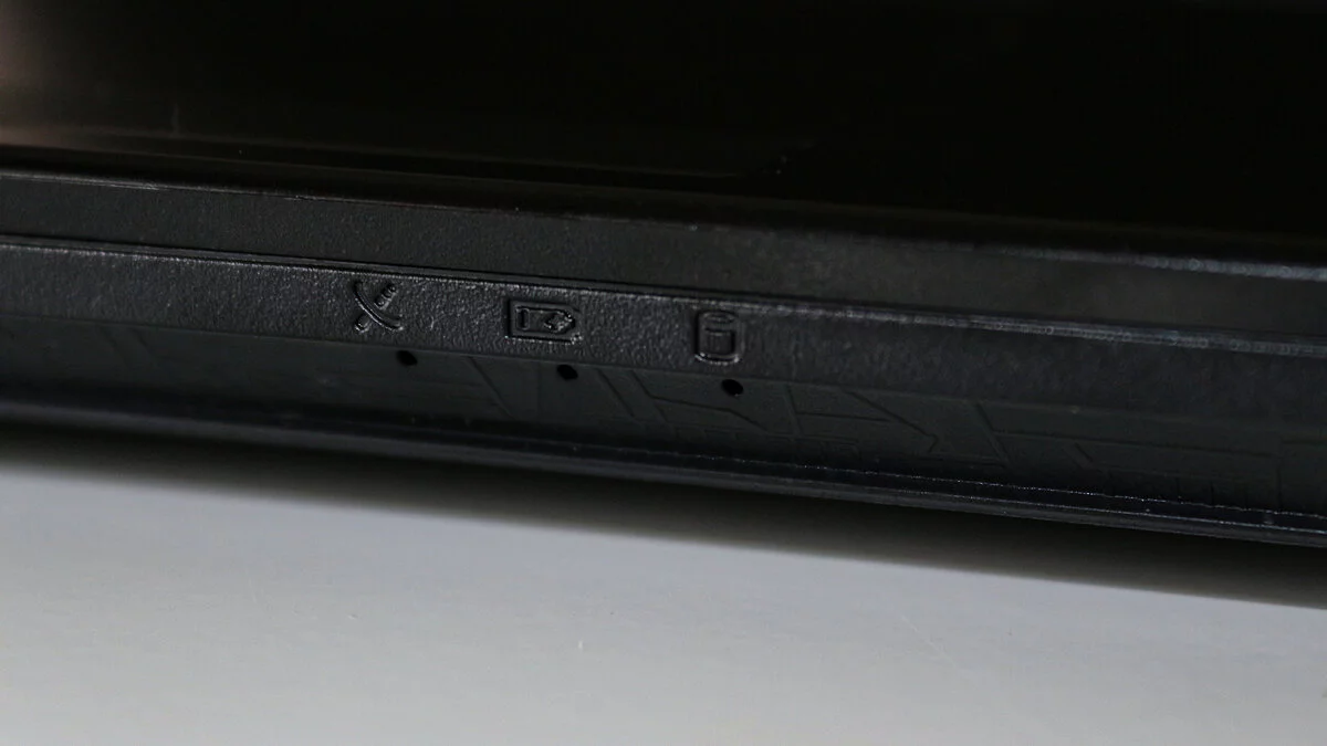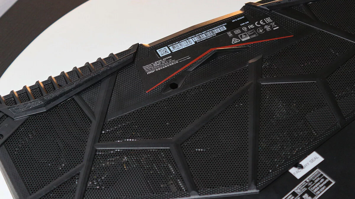 Спереди GL65 светит тремя индикаторами, направленными вниз, поэтому они не отвлекают. Снизу ноутбук оформлен приятной рамкой с технологическим узором. А на большей части нижней крышки расположились массивные окна вентиляции. При этом прорезиненные ножки размещены таким образом, чтобы отделять холодные и горячие потоки воздуха.