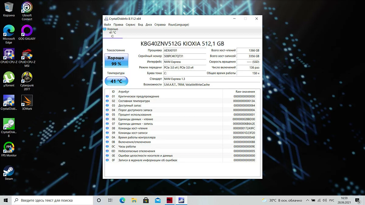 - Дисковая подсистема: 512 ГБ NVMe SSD (KIOXIA/Toshiba KBG40ZNV512G)