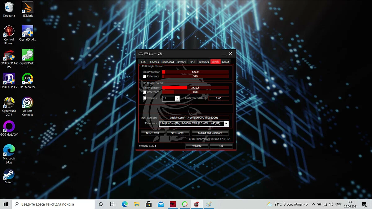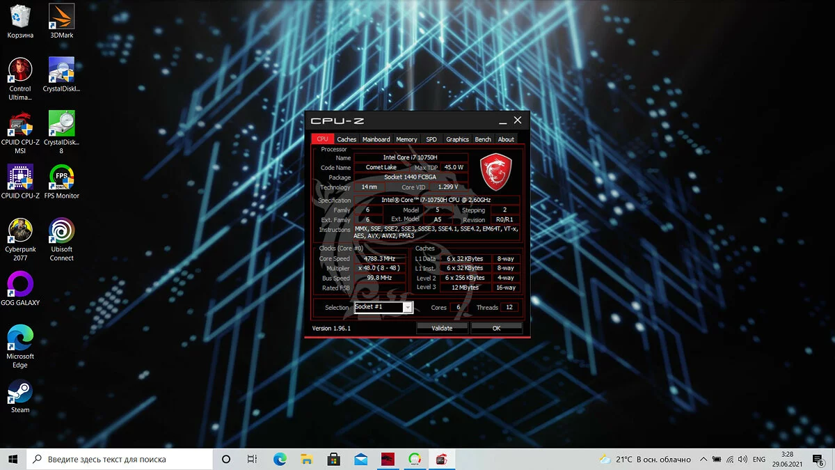 - Процессор: Intel Core i7-10750H (6 ядер, 12 потоков, 2,6 — 5 ГГц, 45 Вт)