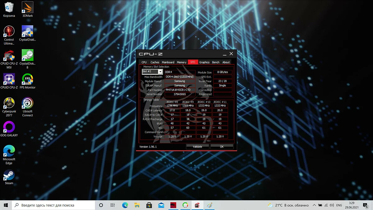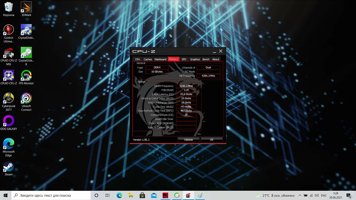 - Память: 16 ГБ (2×8 ГБ) DDR4-2666 (SAMSUNG M471A1K43CB1-CTD, 19-19-19-43)