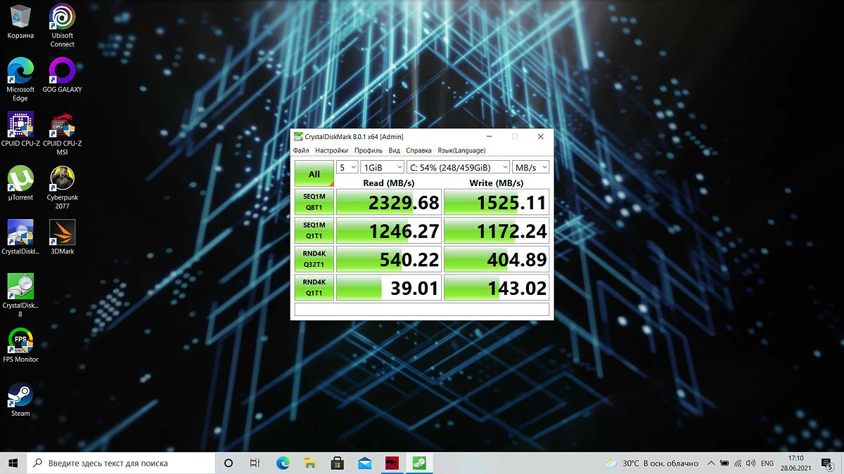 Ноутбук мы проверили в синтетических тестах Cinebench R23, CPU-Z и CrystalDiskMark. Тесты проводились в режиме максимальной эффективности, выставленной в программе MSI Dragon Center.
