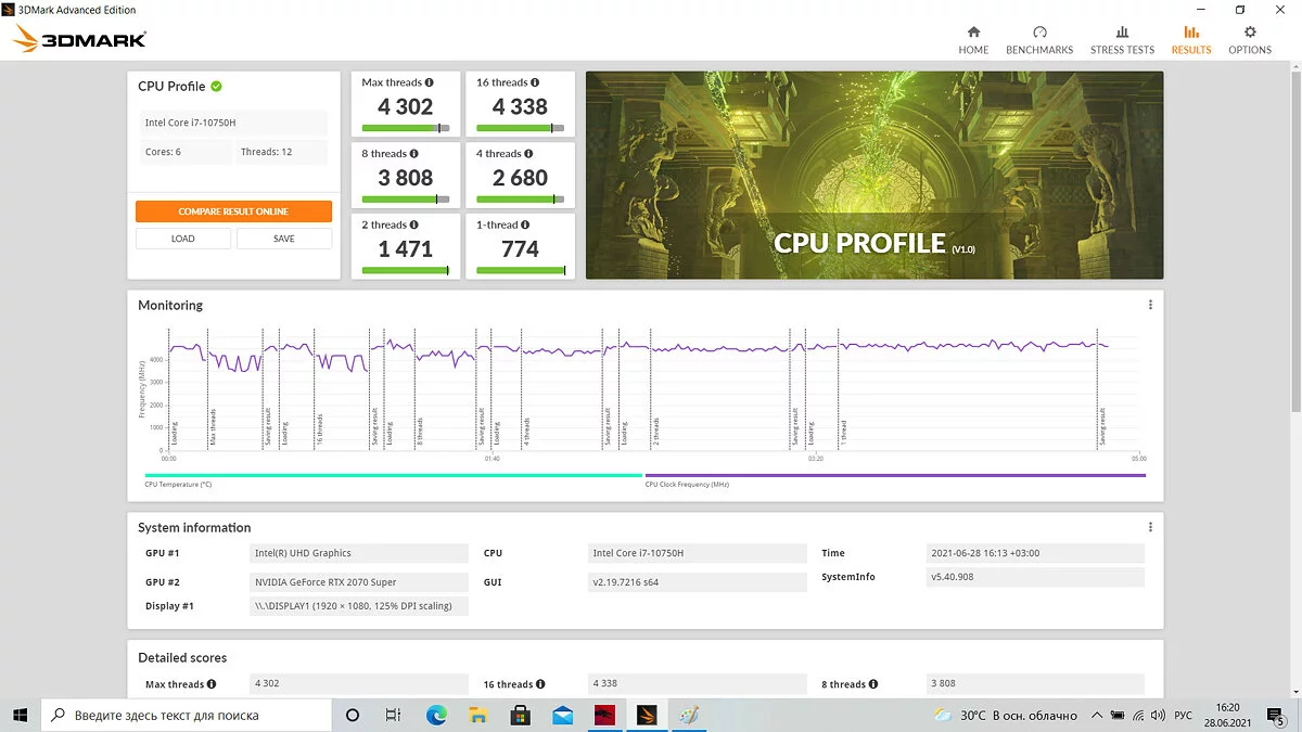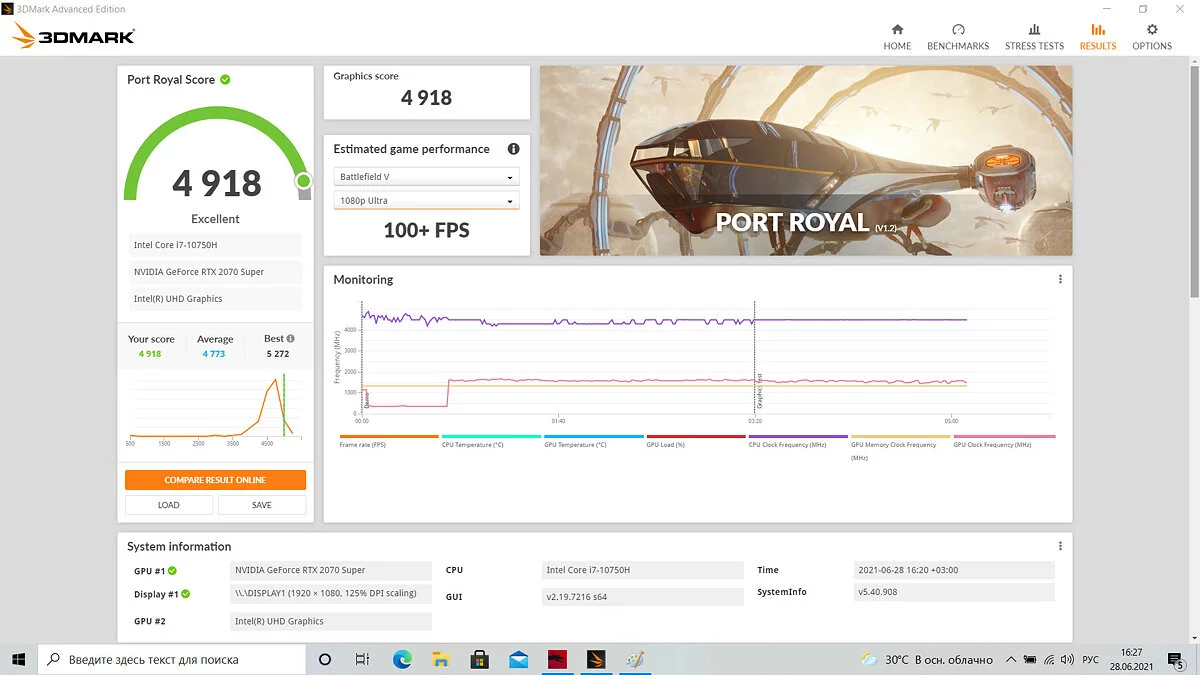 Также мы оценили мощность ноутбука в 3DMark: в тестах Time Spy, Time Spy Extreme, Fire Strike, Fire Strike Extreme, CPU Profile и Port Royale. Последний тест мы решили провести для проверки мощности в режиме с трассировкой лучей и DLSS. Результаты говорят сами за себя: