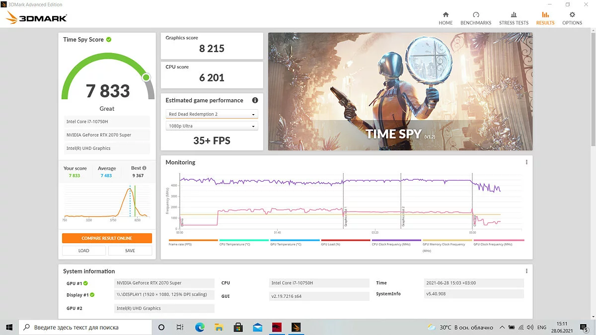 Все игровые тесты мы также провели в режиме максимальной производительности. Стоит отметить, что температура процессора стала достигать неприятного значения в 97 градусов. Такой режим работы Core i7-10750H хоть и даёт преимущество в играх, мы бы не советовали постоянно его включать. Поэтому если говорить о долгосрочной службе, то стоит обратить внимание на сбалансированный режим питания и возможность отключения Turboboost в настройках.