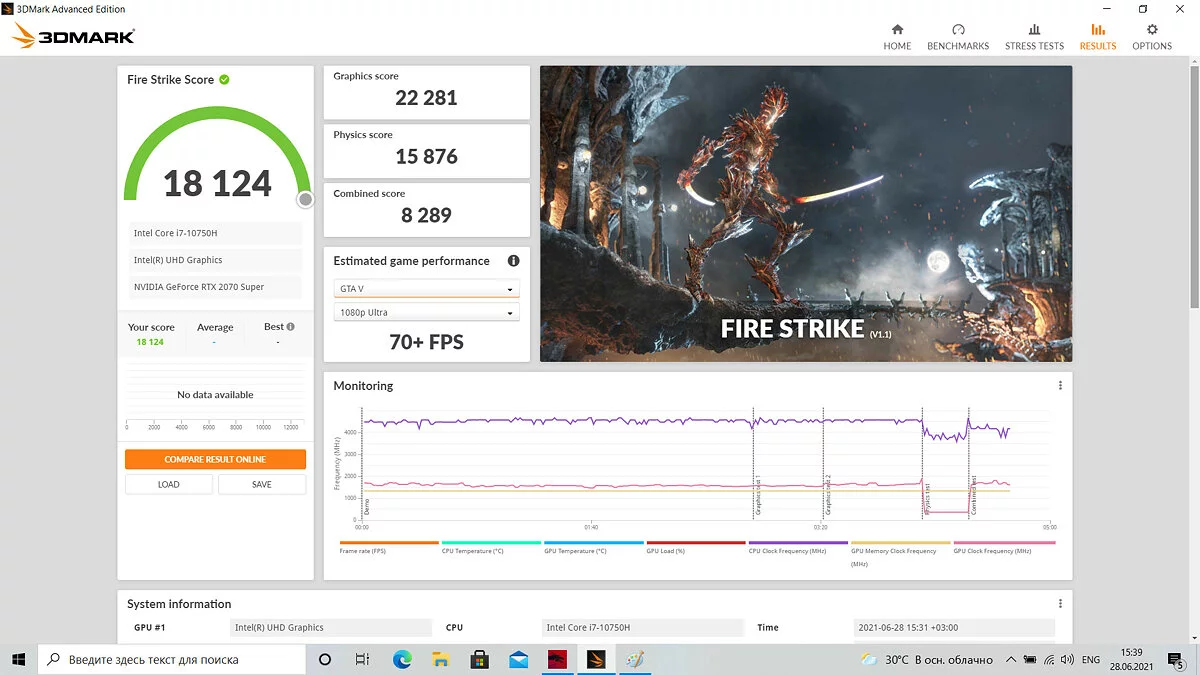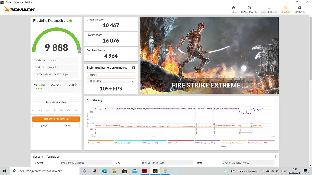 Отметим, что NVMe SSD 512 ГБ для 2021 года кажется уже тесным, поэтому сразу стоит подумать о добавлении ещё одного диска. Несколько удручает, что процессор сильно греется: за температурой Core i7-10750H придётся следить. Даже видеокарта у ноутбука холоднее процессора почти на 20 градусов.