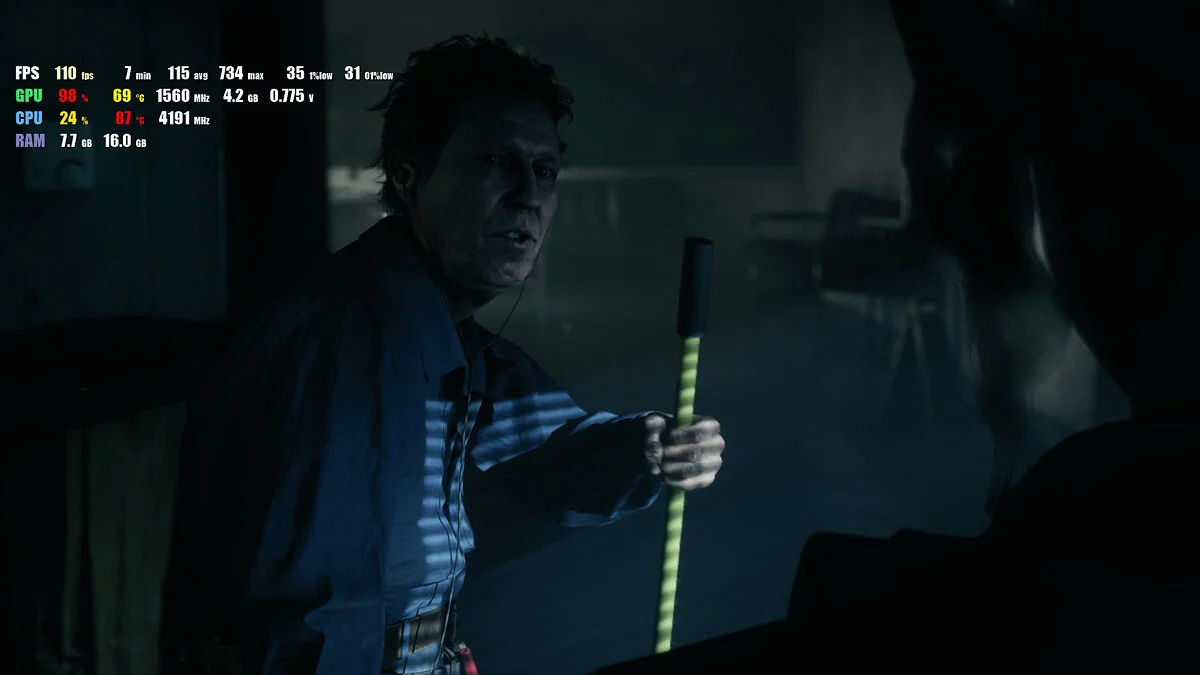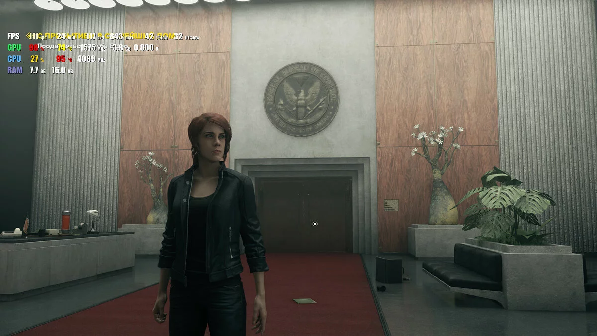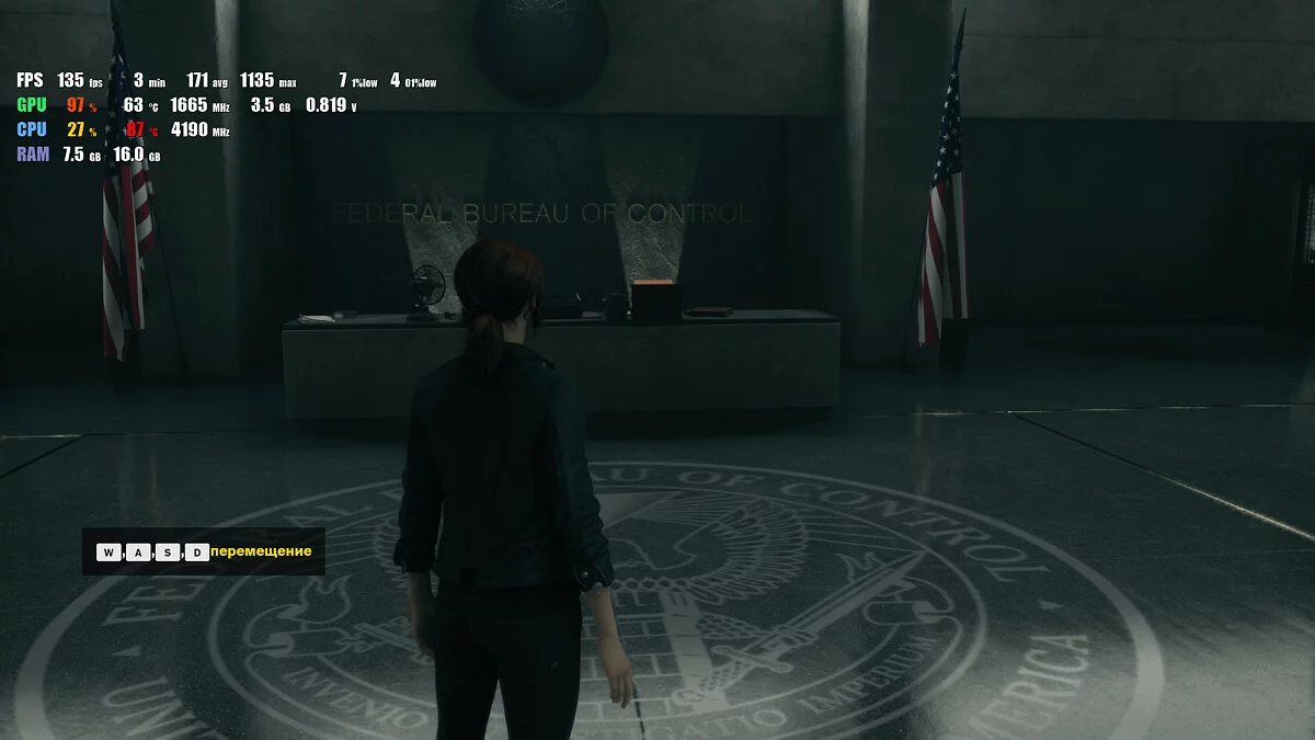 Control. В хите Remedy мы установили высокие настройки графики и включили DLSS. Сразу же получили плавные 110-130 FPS, которых, конечно, не хватило до нативной частоты экрана в 144 Гц для идеальной картинки. Включение трассировки лучей сильно повлияло на количество кадров в секунду, но, поигравшись с настройками, можно получить стабильные 60 FPS.