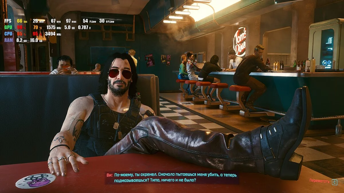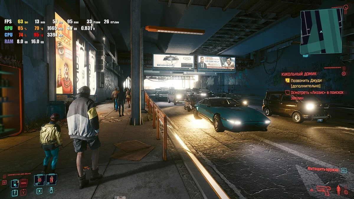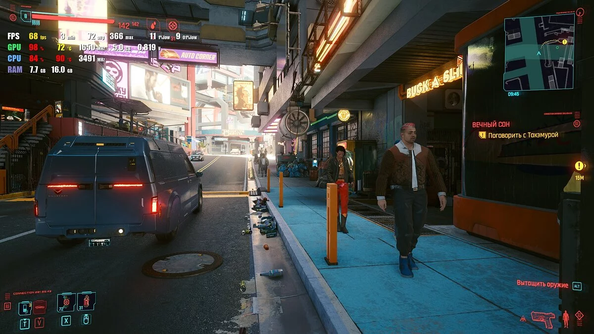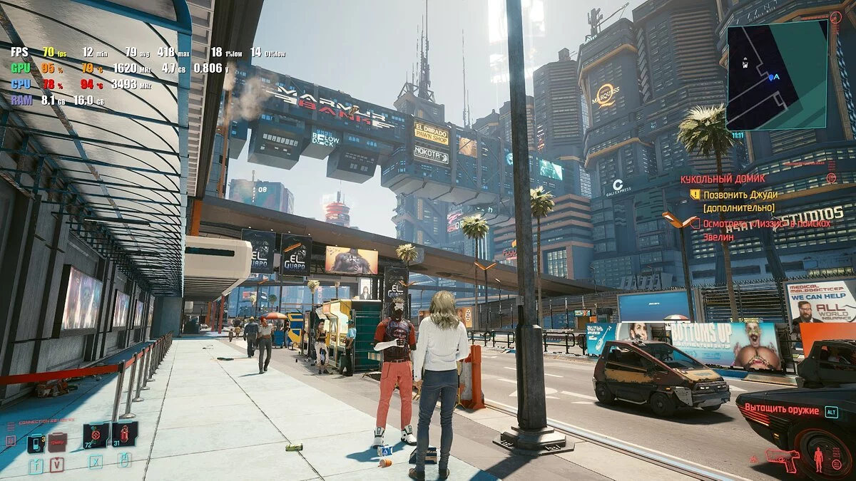 Cyberpunk 2077. Мы протестировали ноутбук на версии игры 1.23, которую разработчики уже называют удовлетворительной по производительности. Как и в Control, остановились на высоких настройках графики с включённым DLSS. Без трассировки лучей действительно можно играть, позабыв о сильных просадках ниже 60 кадров в секунду. За стабильными FPS придётся перейти на средние настройки.