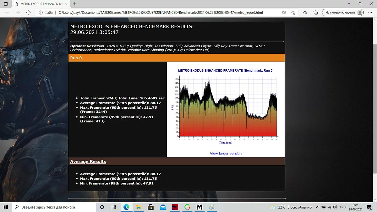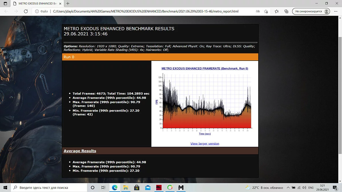 Metro Exodus Enhanced Edition. Обновлённая игра с поддержкой DLSS 2.0 и полноценной трассировкой лучей буквально требовала от нас теста. Мы прогнали с тремя вариантами настроек бенчмарка (высокие настройки, ультра-настройки и экстремальные настройки). Результаты ноутбук показал отличные: при включённом рейтрейсинге можно приятно играть с 80+ FPS.