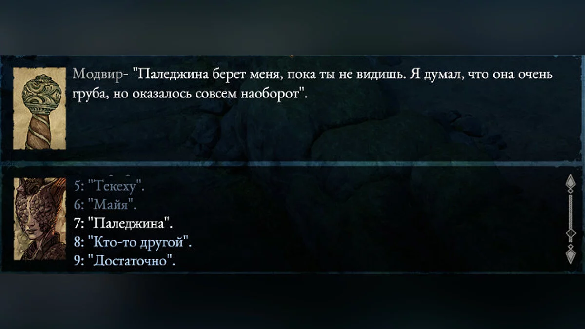 Гуляя по огромному городу Никитака в Pillars of Eternity 2, можно забрести в загадочное подземелье. Там героев ждут не только квесты и могучие враги, но и необычный говорящий меч Модвир. В начале Модвир особо не болтает, но чем больше вы будете им пользоваться, тем сильнее и разговорчивее он становится. Вскоре выяснится, что прежний владелец выбросил клинок и причинил ему сильную боль. Теперь меч в депрессии...