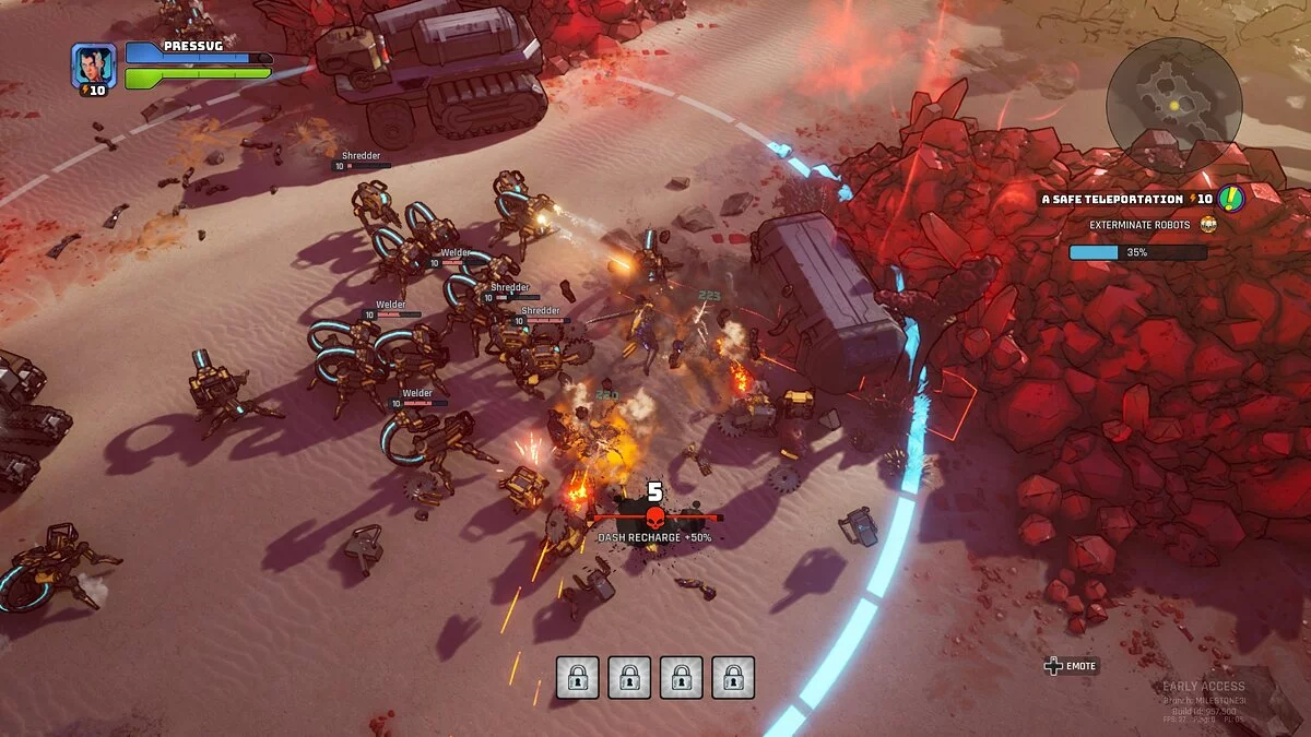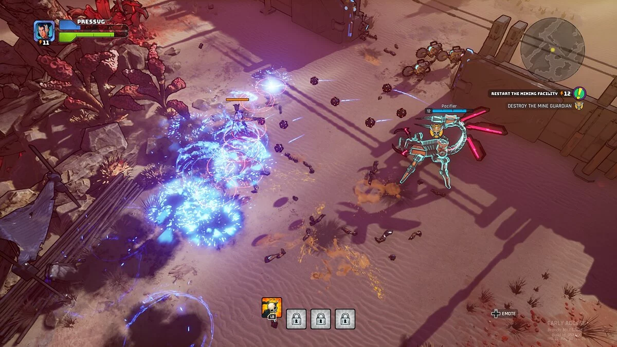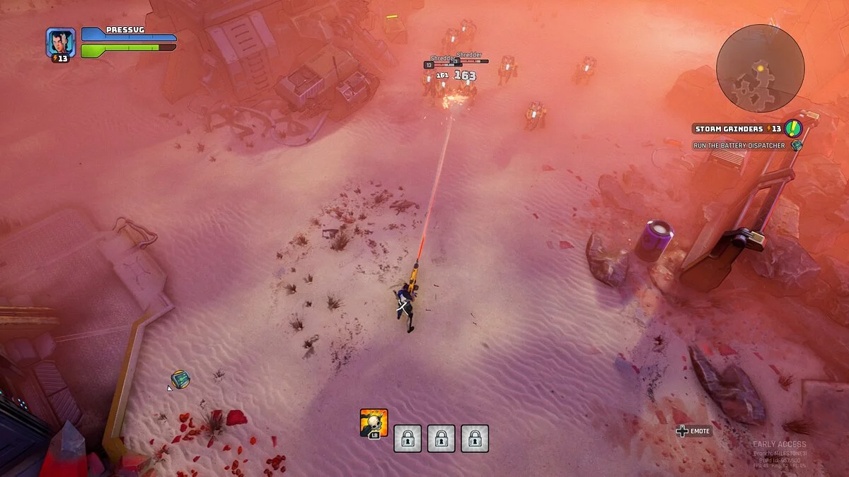 Бета-версия сразу бросает геймера в бой. Стоит нажать на кнопку «Старт», как вам предложат выбрать одного из четырёх героев, покажут небольшой хаб и отправят на первое задание. Секунд за 30 разработчики расскажут об управлении и бросят вас посреди пустыни. Несмотря на то, что герои могут атаковать в ближнем бою, стрелять, дэшить, применять способности и много чего ещё, осваиваешься в игре сразу же. Первая поверженная группа монстров лишь придаёт уверенности.