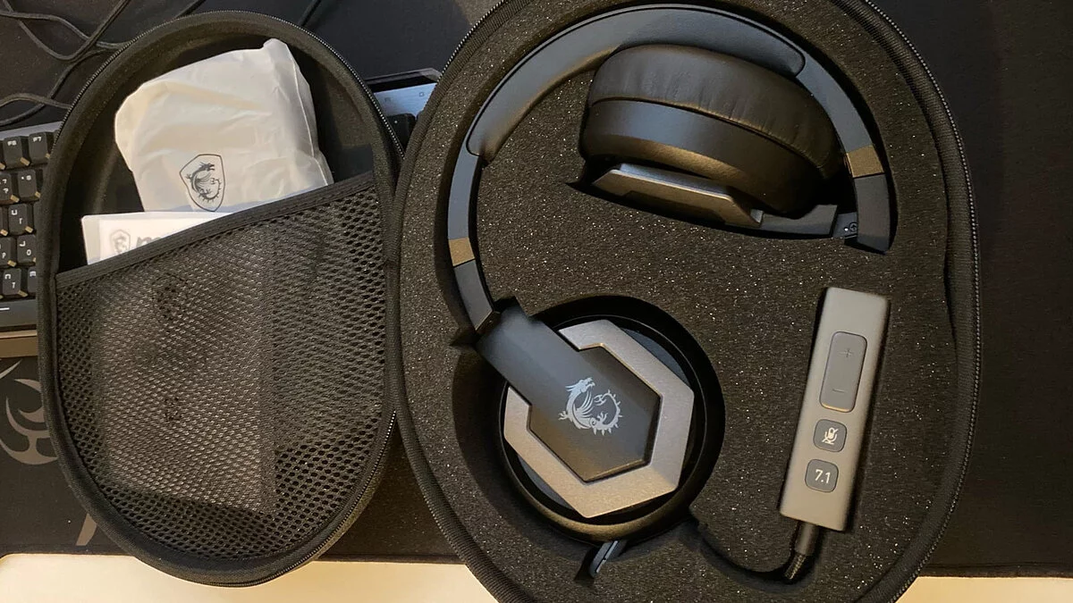 Но зато девайс может похвастаться кожаной вставкой на изголовье, а также кожаными амбушюрами. Бонусом MSI предлагает сменные амбушюры с тканевой подложкой на выбор пользователя. Поменять их не составит большого труда, а дополнительные всё равно пригодятся в будущем. Также стоит отметить, что с гарнитурой в комплекте идёт внушительный чехол с внутренним карманом.