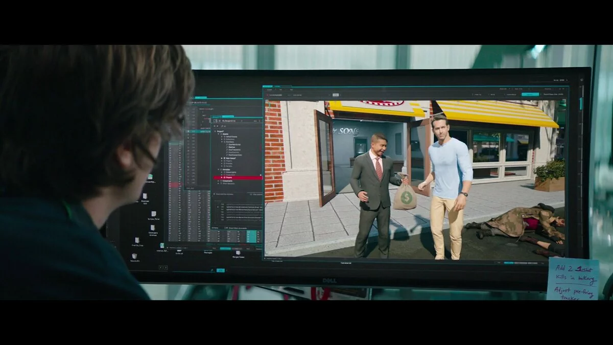 О том, что Парень живёт в игре чаще вспоминаешь из эпизодов, которые происходят в реале. Одна из сюжетных линий рассказывает о разработчиках: один работает на корпорацию зла, которая выпустила онлайн-игру, вторая — хочет её уничтожить. Плюс в кадре часто появляются популярные стримеры вроде Ninja, которые зависают в Free City.