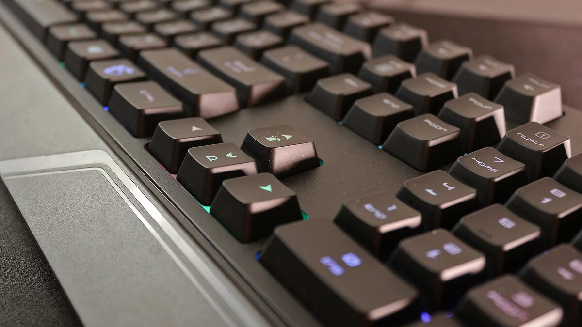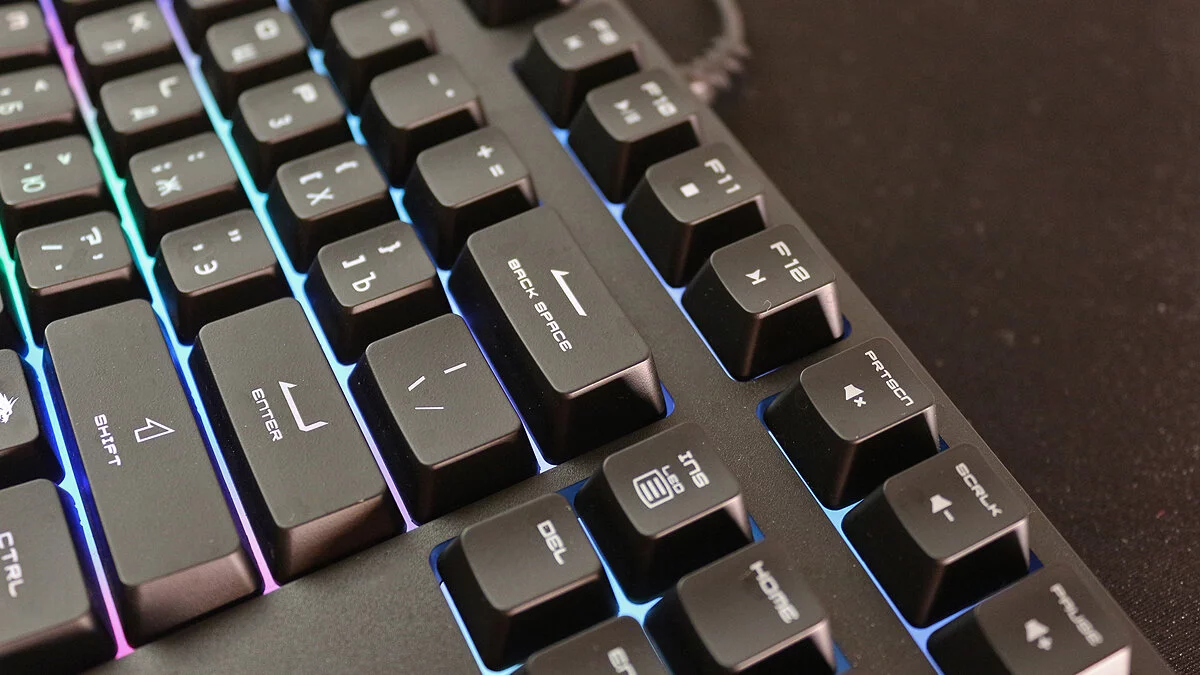 Для начала отметим удобные вогнутые шляпки клавиш, на которые было комфортно нажимать как во время игры, так и при наборе текста. Ещё один плюс — это вполне тихое нажатие даже для мембранной клавиатуры.