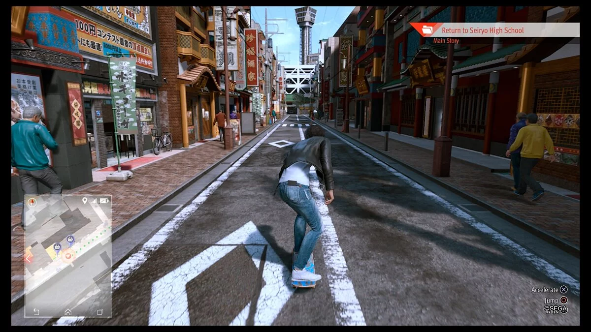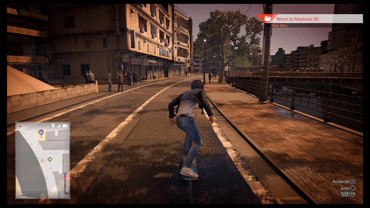 А вот перемещение по городу реализовано идеально. Ягами может бродить по улицам, гонять на скейте или кататься на такси. При этом такси можно как встретить на дороге, так и вызвать в любое место. Если не хотите тратить время на путь к цели, нажмите пару кнопок и окажетесь на месте задания.