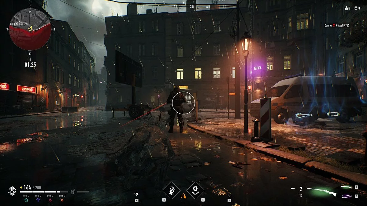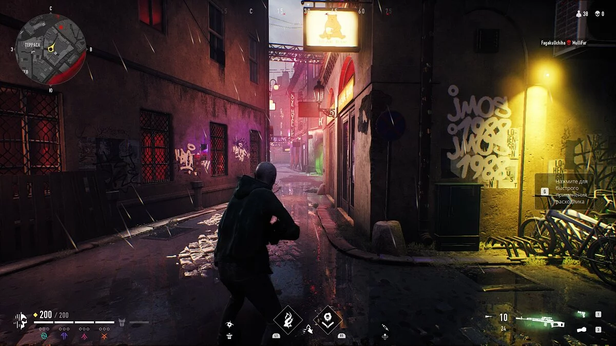 Местом действия Bloodhunt стала Прага. Уже на первой катке столица Чехии завораживает архитектурой и стилем. Старенькие дома, готические фонари, неоновые вывески, возвышающаяся над постройками церковь — локацией можно залюбоваться. На десятом часу игры, когда вы, казалось бы, выучите каждый закоулок, Прага всё равно продолжит впечатлять.
