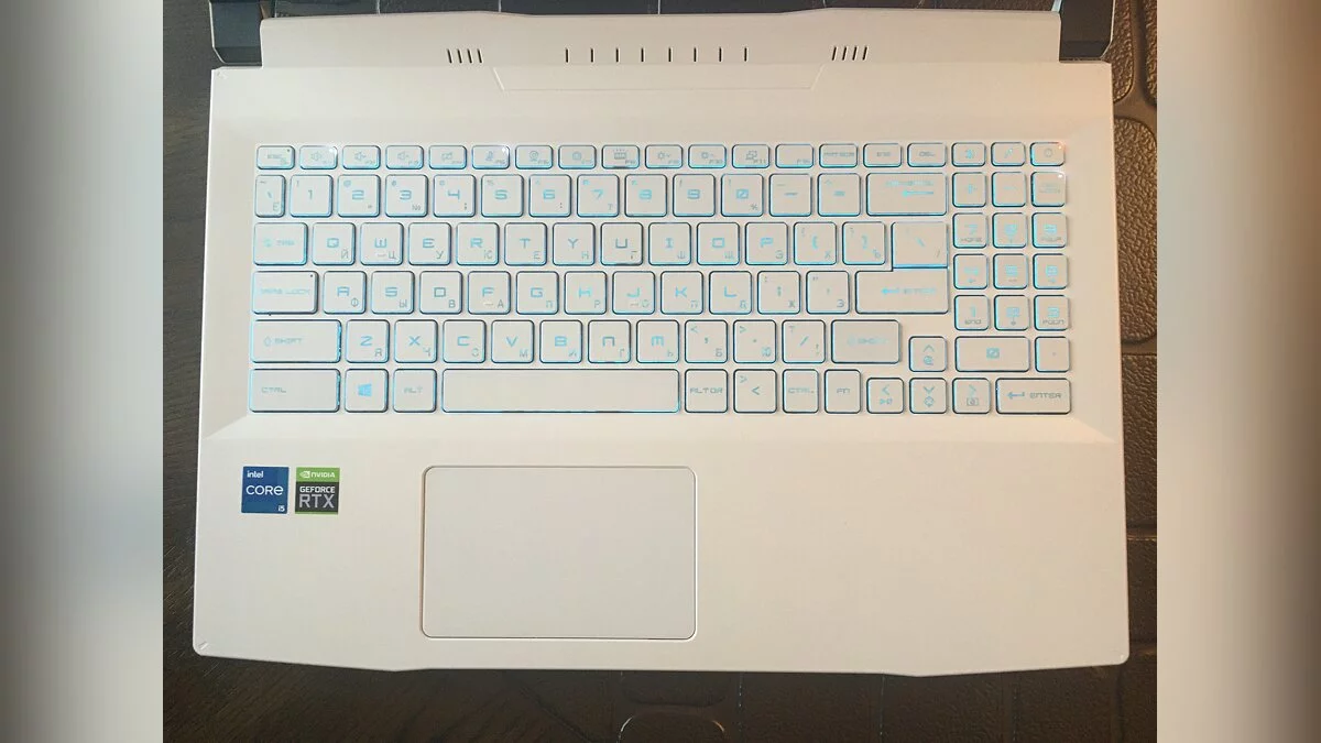 MSI Sword 15 выгодно выделяется довольно редким на сегодняшний день сочетанием белоснежной отделки со вставками черного цвета. Это отличный вариант для любителей белой электроники — стандартная гамма современных игровых лэптопов редко выходит за рамки оттенков черного и серого. В дополнение к эффектному внешнему виду белая отделка весьма практичная: на ней практически не остается отпечатков.
