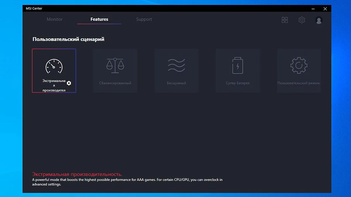 Здесь вы вольны выбирать: когда вам нужна максимальная производительность ценой большего нагрева и шума — ставьте «Экстремальную производительность»; если важен акустический комфорт, то можно смело ставить «Сбалансированный режим». В основном это будет зависеть от конкретной игры.