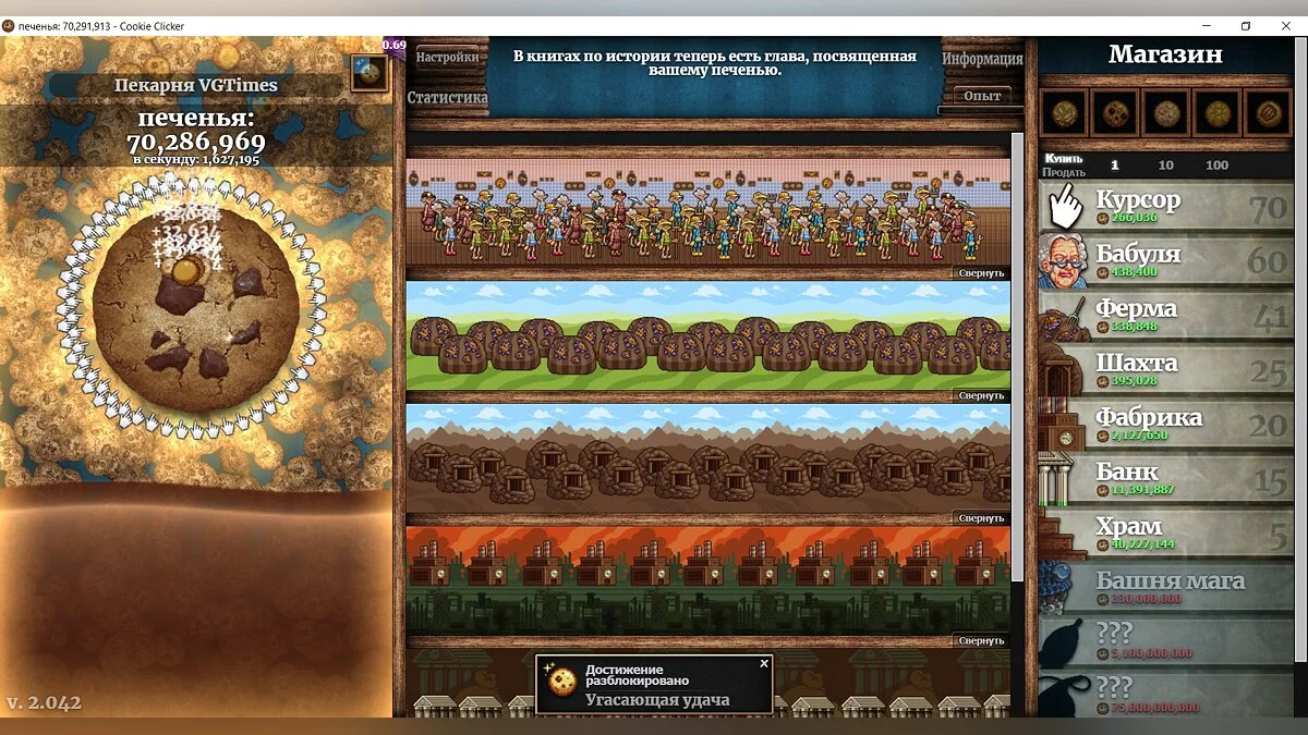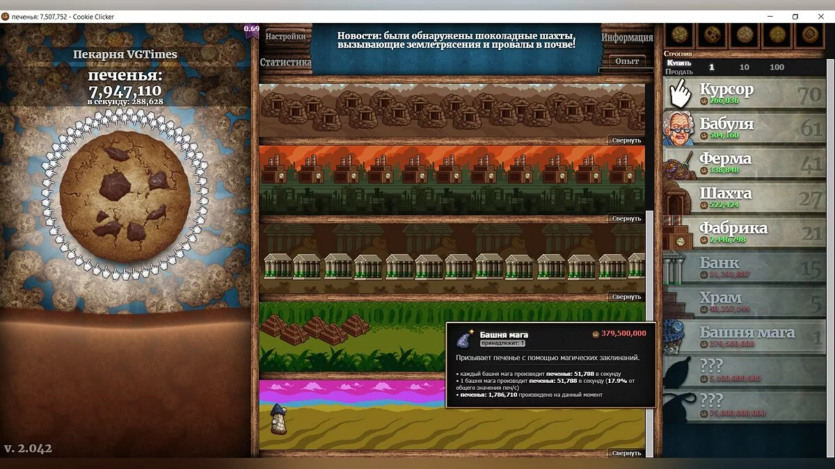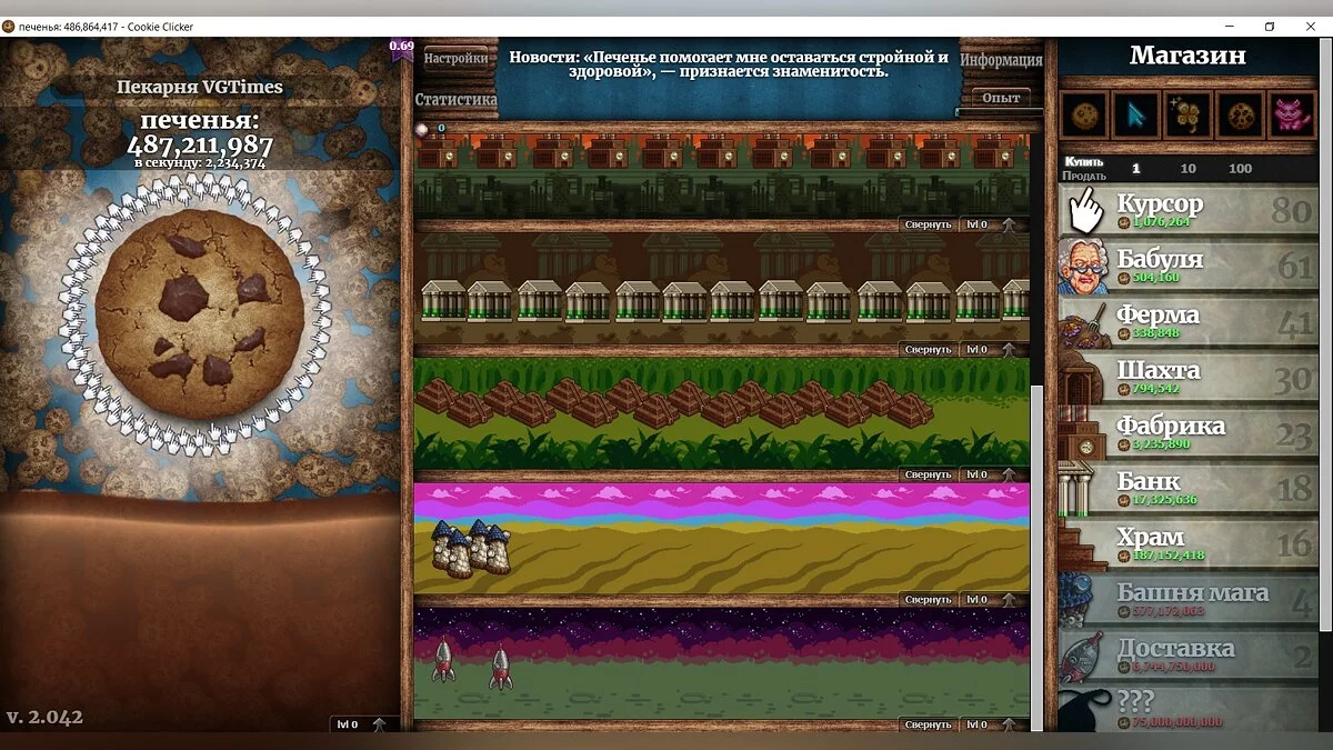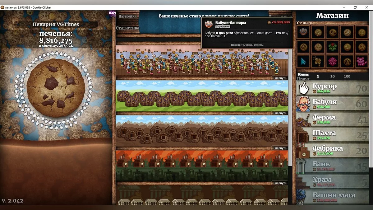 Со временем можно вообще перестать кликать самостоятельно — и без ваших усилий казна будет каждую секунду пополняться миллионами печенек. Вашей задачей будет постройка новых производств и улучшение текущих. В остальном можно расслабиться и следить за добычей колоссальных масштабов.