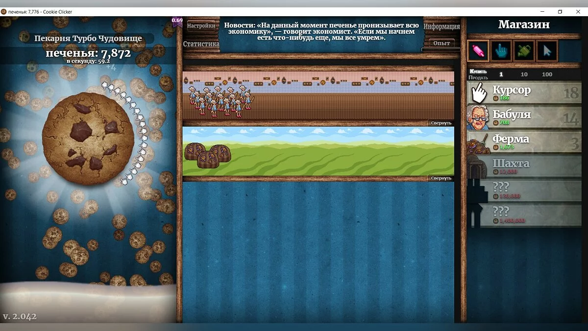 Каждая добытая печенька — это ресурс. Скоро вы сможете вложить богатства и нанять курсор, который будет раз в несколько секунд делать клик вместо вас. Затем удастся нанять бабульку, готовую стать крутым пекарем. Со временем масштабы производства вырастут ещё сильнее.