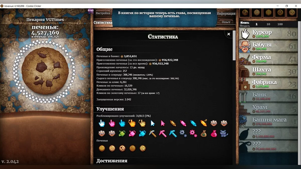 Фишка в том, что формула Cookie Clicker оттачивалась с 2013 года — именно тогда вышла базовая версия проекта. За восемь лет механики не раз обновили и улучшили. В итоге получилась игра, которая взорвала чарты Steam.