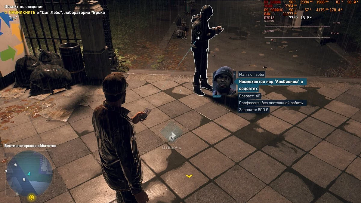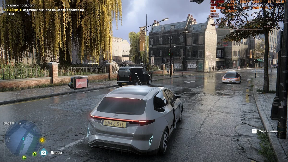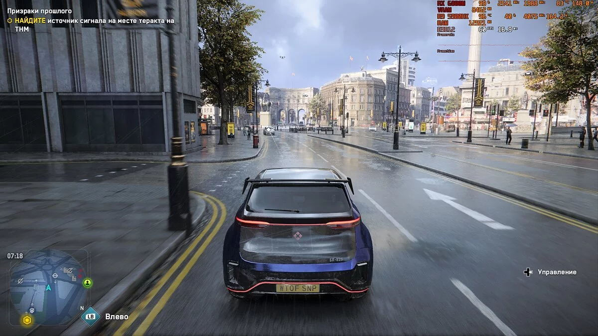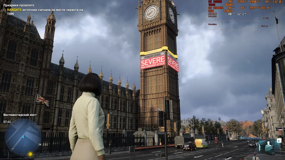 Watch Dogs Legion мы запустили на ультранастройках в разрешении 1080p. В таком режиме игра работает при 60 кадрах, с просадками до 50 в тяжелых условиях (активная езда по городу и т.п.). В более простых сценах FPS переваливает за 80. При включении трассировки лучей на «среднее» частота кадров просаживается до 25-30 кадров.