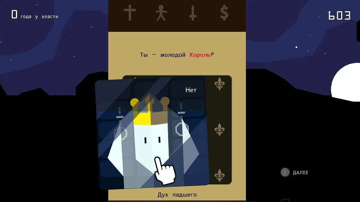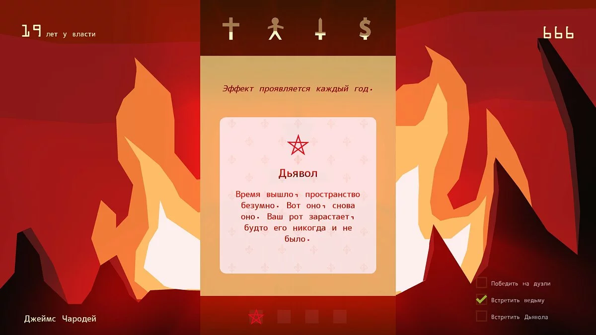 Дело в том, что король должен следить за четырьмя показателями: церковью, народом, армией и казной — каждая просьба влияет на их состояние. Например, к вам приходит генерал и требует построить новую башню для защиты города. Если согласитесь, армия станет сильнее, но золотишко в казне поубавится. А вот пришёл травник, который хочет лечить больных крестьян. Народ обрадуется, если одобрите его назначение, но церковь выступит против этого еретика.