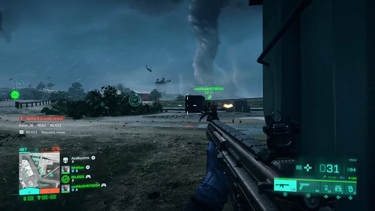 Что ещё круче, так это огромный торнадо, который периодически залетает на карту и устраивает локальный апокалипсис. Природное явление впечатляет мощью и заставляет удирать, что есть силы. Торнадо затягивает транспорт, бойцов, вертолёты и кружит их в диком необузданном танце. Наблюдать за этим приятно.